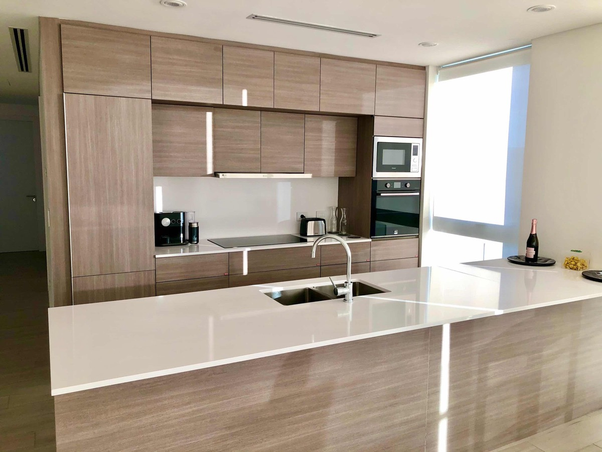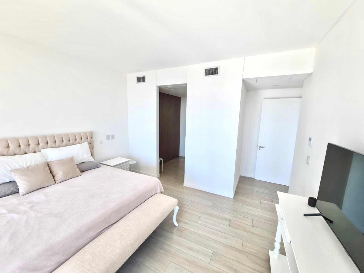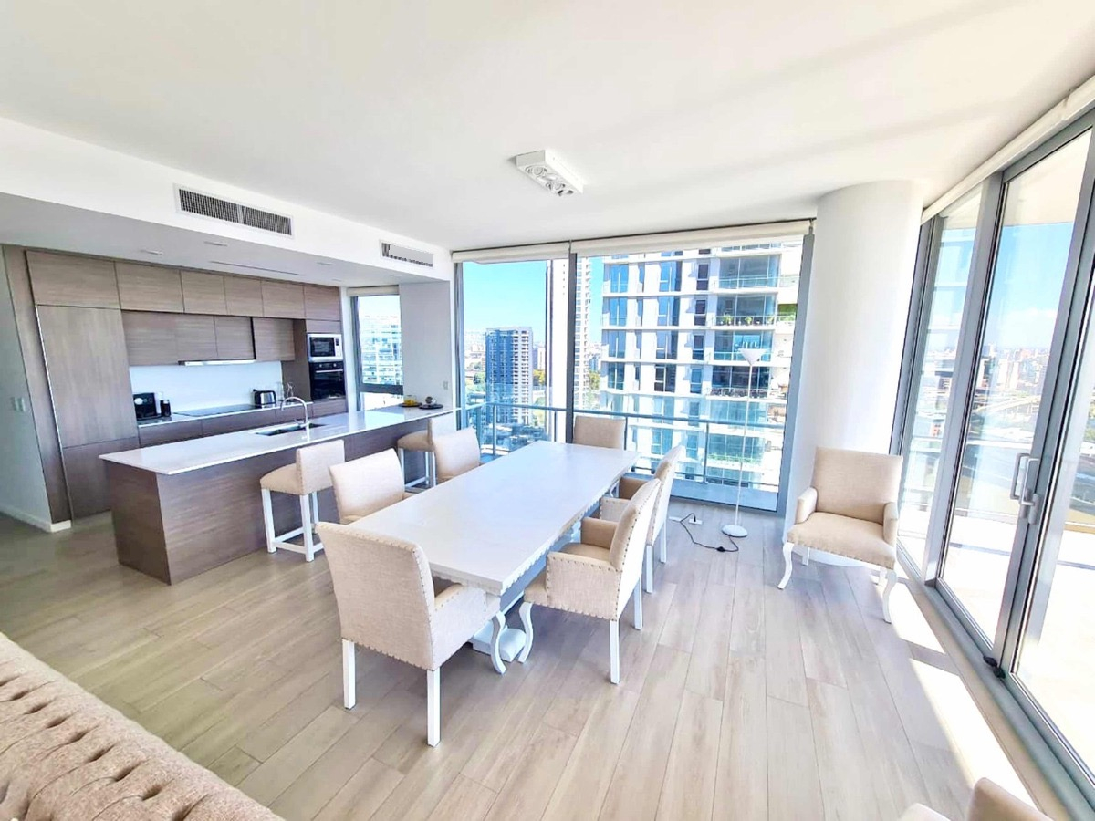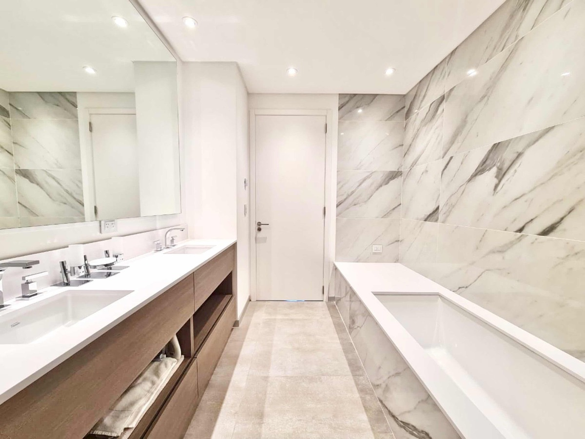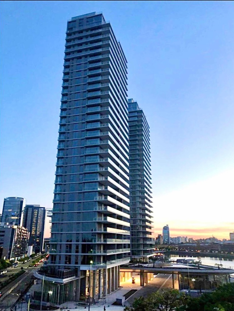 El departamento se ubica en el piso número 20, cuenta con 3 habitaciones en suite, 4 baños con bañera, ducha de vidrio, accesorios de primera calidad. Lavadero independiente. Dependencia de servicio, Cocina integrada con alacena, bajo mesada, totalmente equipada. Gran balcón con vistas al Dique y al Puente de La Mujer terraza con parrilla, mesada y bacha. Cuenta con 2 cocheras en el primer subsuelo y una baulera en el primer subsuelo.