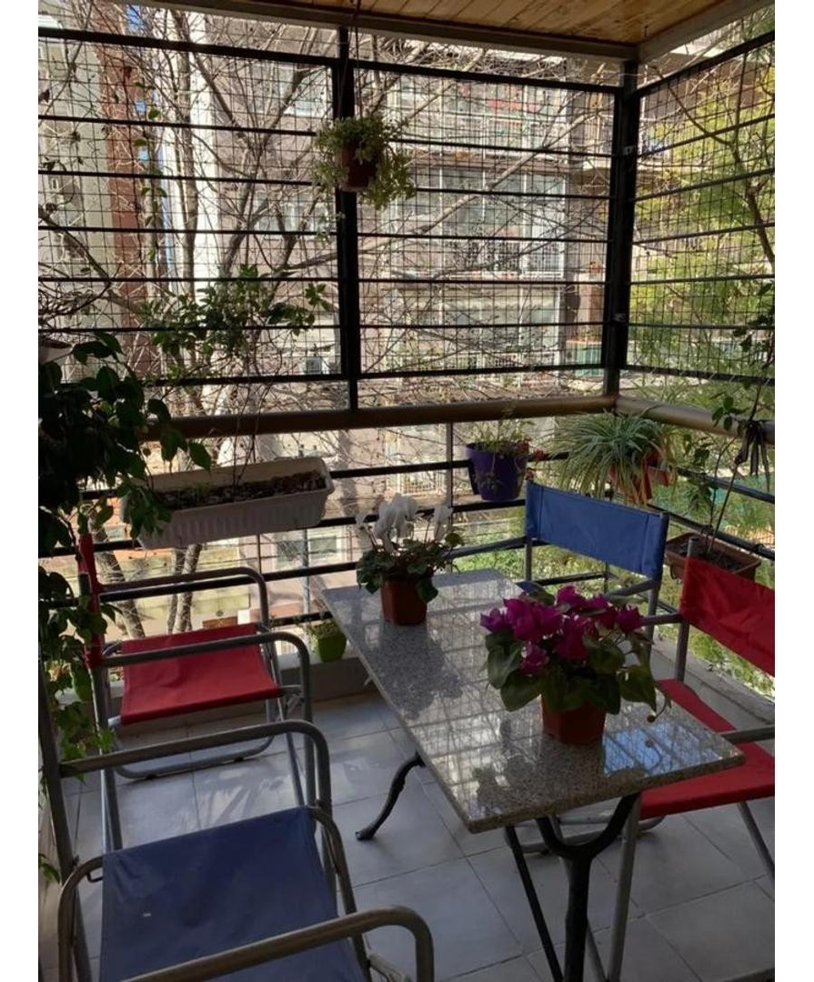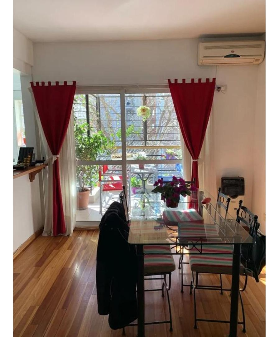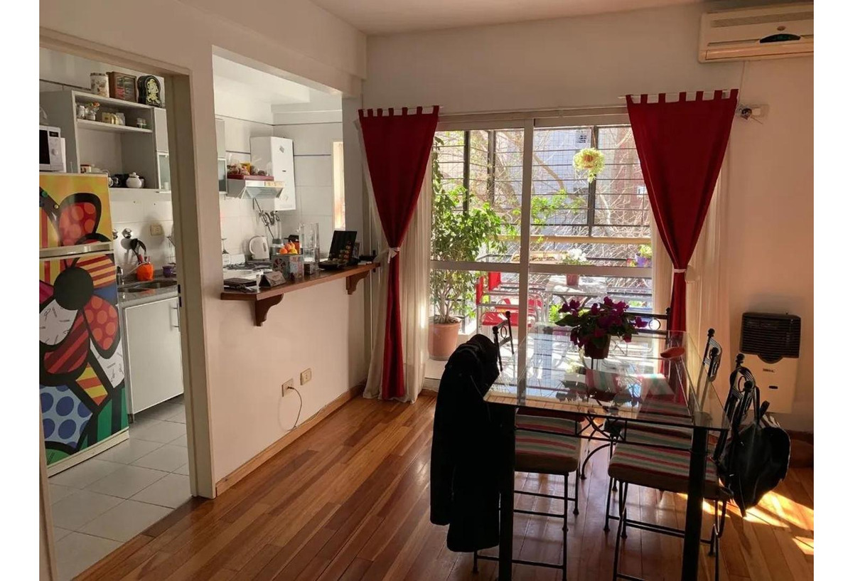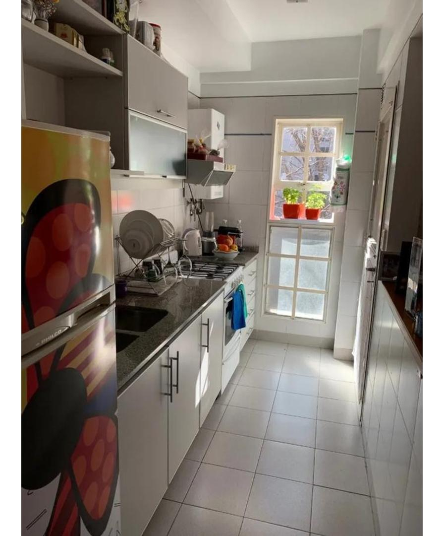 Cocina semi integrada(fácilmente se puede volver a independizar),barra de madera,mucho espacio de guardado y lavadero. Living y cocina con salida a balcón.