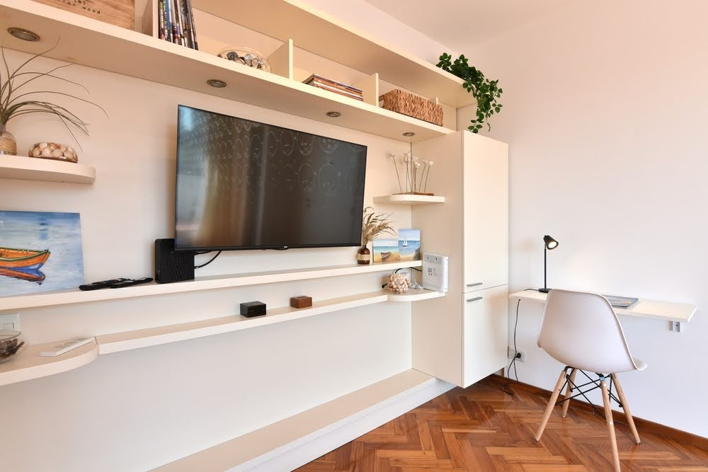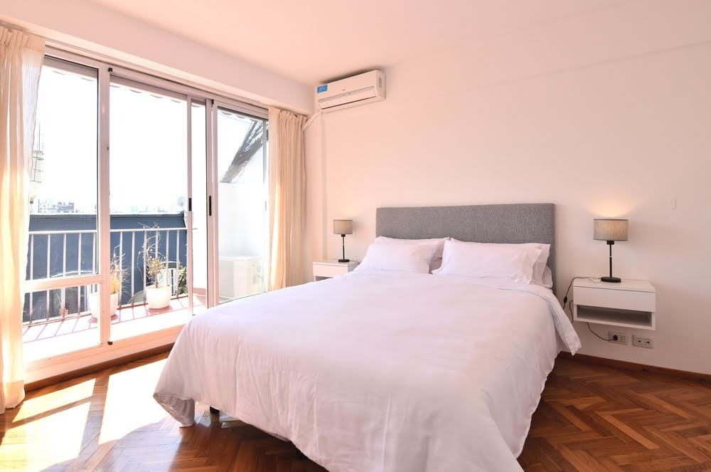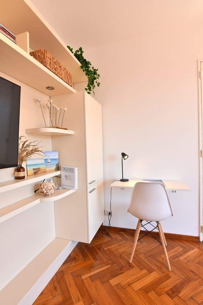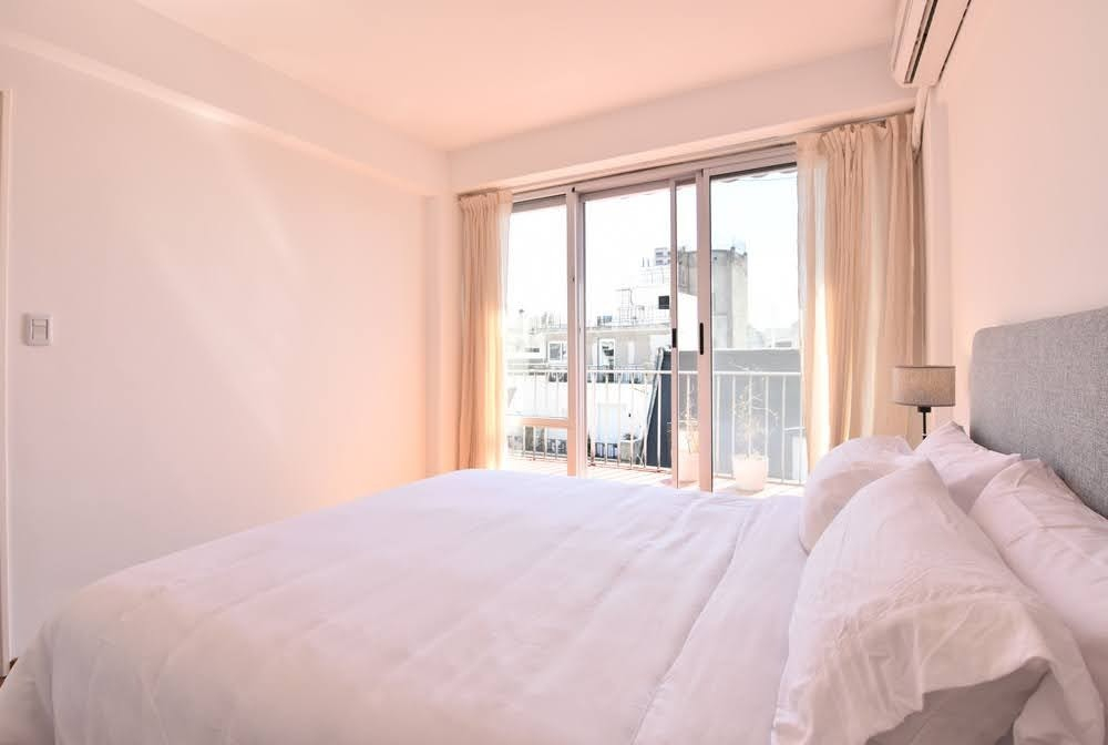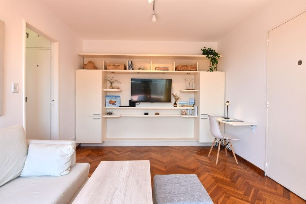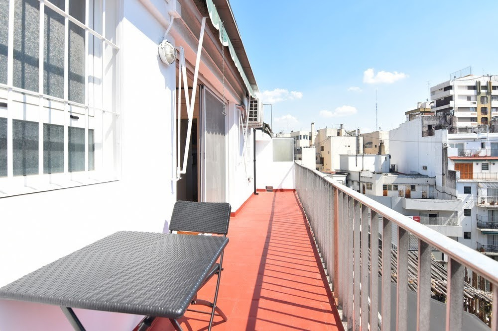 Hermoso departamento completamente renovado y muy luminoso. El departamento está en un piso alto, tiene un balcón corrido muy amplio con vista a los techos de la ciudad. Living comedor con cómodo sillón, mesa baja y banquetas. Sector de escritorio con mueble multinfución, TV y espacio de guardado. Cocina totalmente equipada. Dormitorio con cama Queen, placard. Amplio placard en el pasillo. Baño completo. A/A en ambos ambientes.