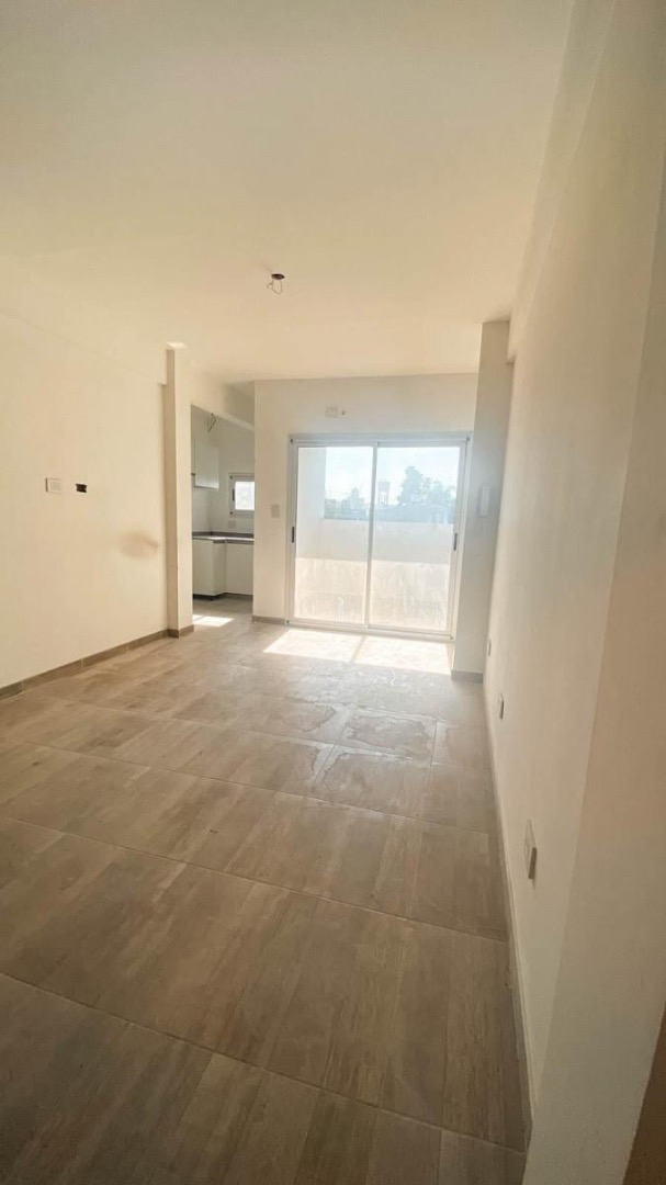 Es un monoambiente Divisible, al ingresar tenemos el ambiente principal de frente a el tenemos el ventanal con ventanas de vidrio corredizas que dan hacia el balcón, cuenta con una pequeña cocina separada del ambiente principal con alacena y bajo mesada de melanina, Sus pisos son de color marrón con cerámica y todo pintado de un color natural. El Baño cuenta con combo de Vanitory con dos puertas para guardar articulo de baño, cuenta con bañera, equipado con sus griferías y ducha. El departamento no cuenta con Gas Natural, es todo eléctrico.