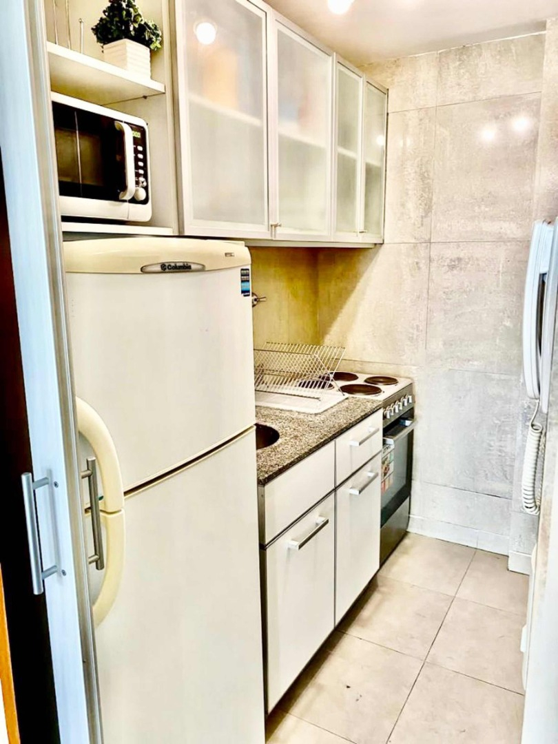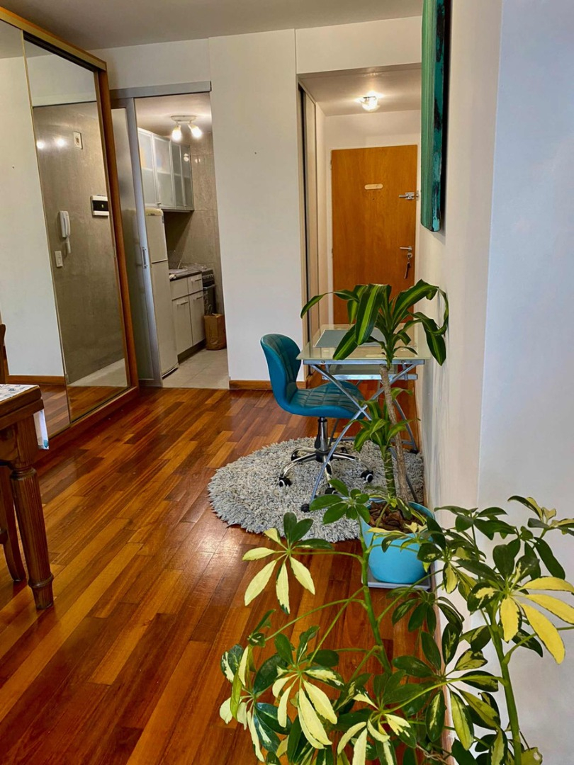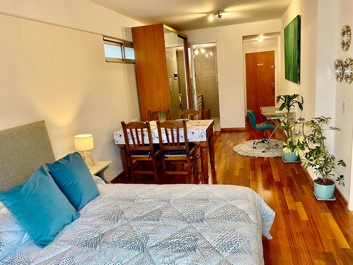 Cálido monoambiente remodelado y moderno con balcón al pulmón de manzana. Cuenta con cocina independiente equipada con horno, anafe eléctrico, heladera con freezer, pava eléctrica, cafetera, microondas y utensilios de cocina. Baño completo con bañera. Gran placard con espejo para guardado. Mesa y sillas comedor, cama doble, escritorio, TV, aire acondicionado. Blanqueria completa.