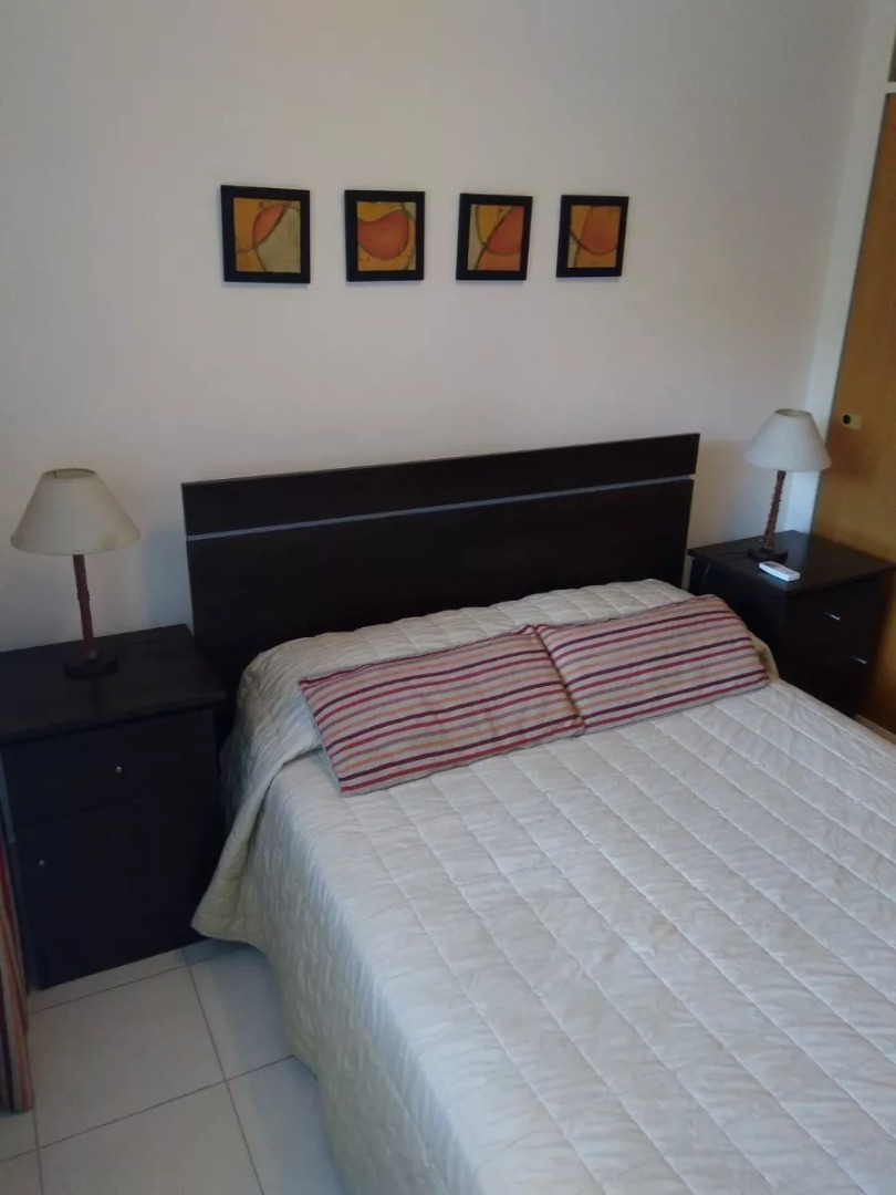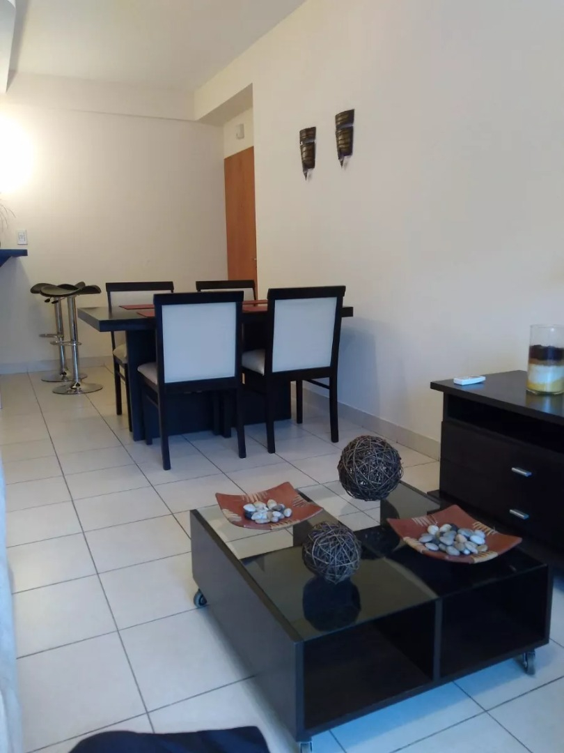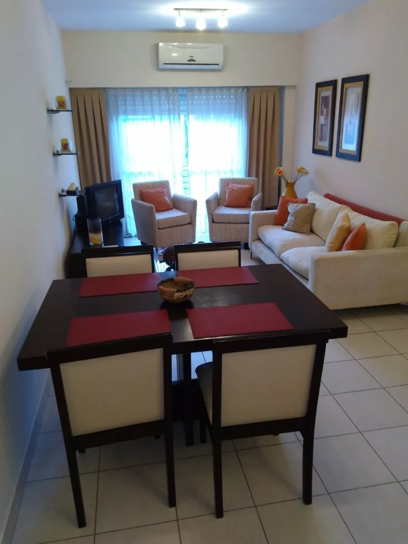 El departamento está ubicado en piso bajo, es amplio y luminoso, cuenta con ventanas en todos los ambientes y salida al balcón desde el living. La cocina está completamente equipada con heladera con freezer, cocina a gas, electrodomésticos, utensilios de cocina y vajilla. El living comedor cuenta con mesa de comedor con sillas, sofá, sillones, TV y aire acondicionado frío/calor. El dormitorio cuenta con cama tamaño matrimonial, mesas de luz, placard amplio, y otro aire acondicionado frío/calor. Tiene también estufa tiro balanceado. El baño es completo con bañera. Tiene patio interno propio.