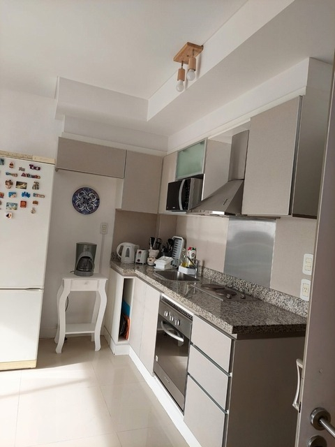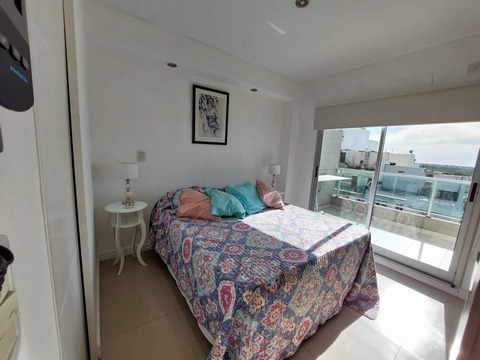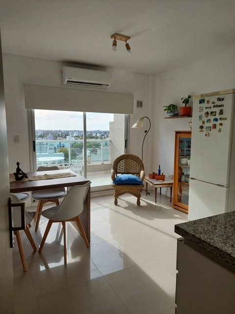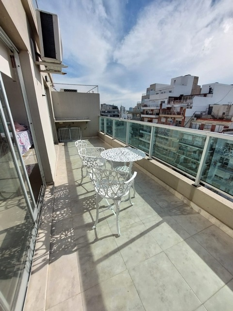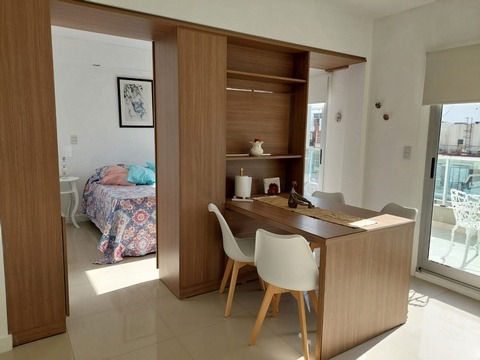 El departamento tiene portero con visor. Es muy luminoso gracias a dos amplios ventanales, ambos con salida al balcón terraza que tiene mesa y sillas. La cocina está completamente amoblada con alacena y bajo mesada, y completamente equipada con heladera con frizzer, anafe eléctrico, horno convector eléctrico, microondas, electrodomésticos, utensilios de cocina y vajilla. El departamento tiene un divisor con estantería y mesa de comedor con cuatro sillas. El área del dormitorio tiene una cama tamaño matrimonial con sus respectivas mesitas de luz y un amplio placard empotrado. Incluye ropa de cama y toallas. El baño es completo con bañera. Tiene internet de alta velocidad.