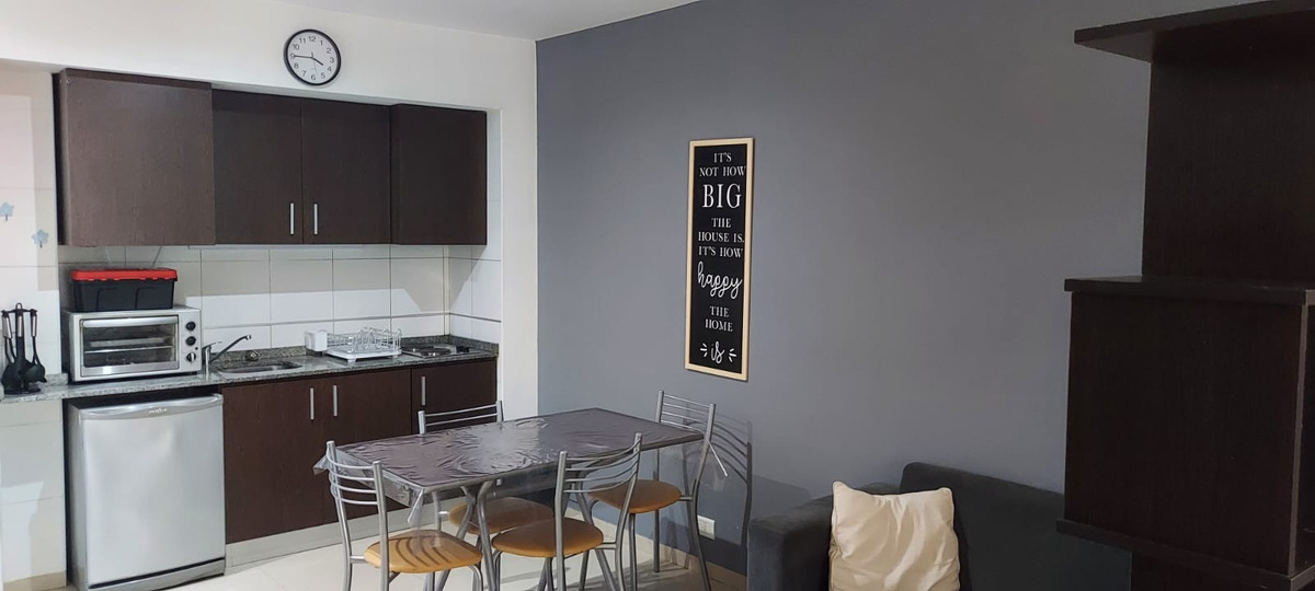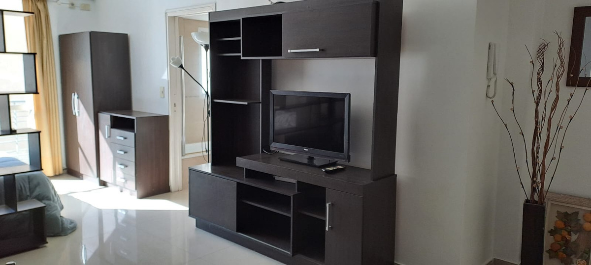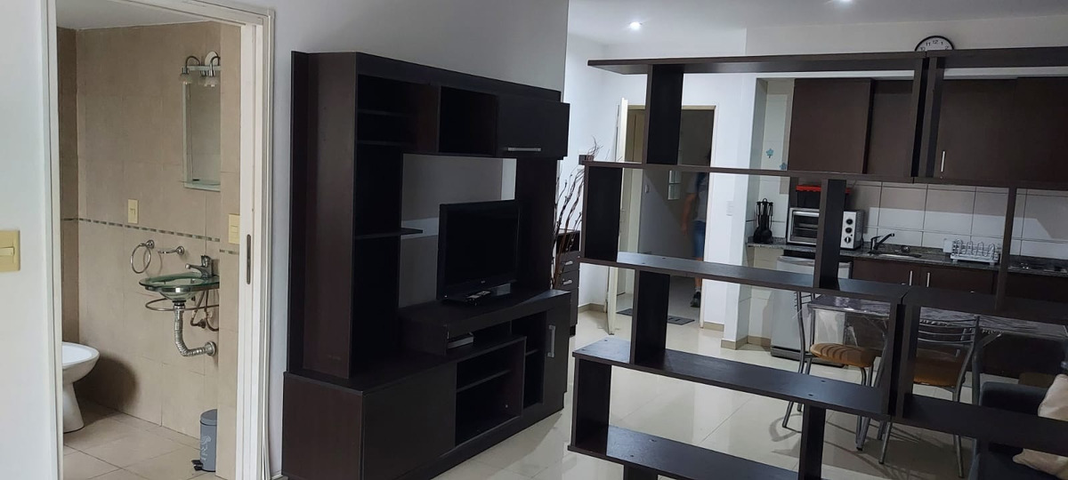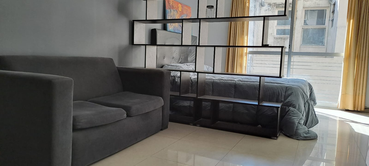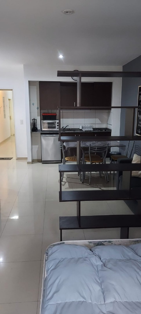 El departamento es luminoso gracias a un ventanal con salida a un balcón con vista hacia la calle. La cocina está amoblada con alacena y bajo mesada y equipada con horno eléctrico, cocina eléctrica, heladera bajomesada, electrodomésticos, utensilios de cocina y vajilla. Cuenta con mesa de comedor con cuatro sillas. Tiene una biblioteca que divide el área del dormitorio que cuenta con una cama tamaño matrimonial, Smart TV, cómoda y placard. Cuenta con aire acondicionado, servicio de cable y Wifi. El baño es completo con bañera. Incluye ropa de cama y toallas.