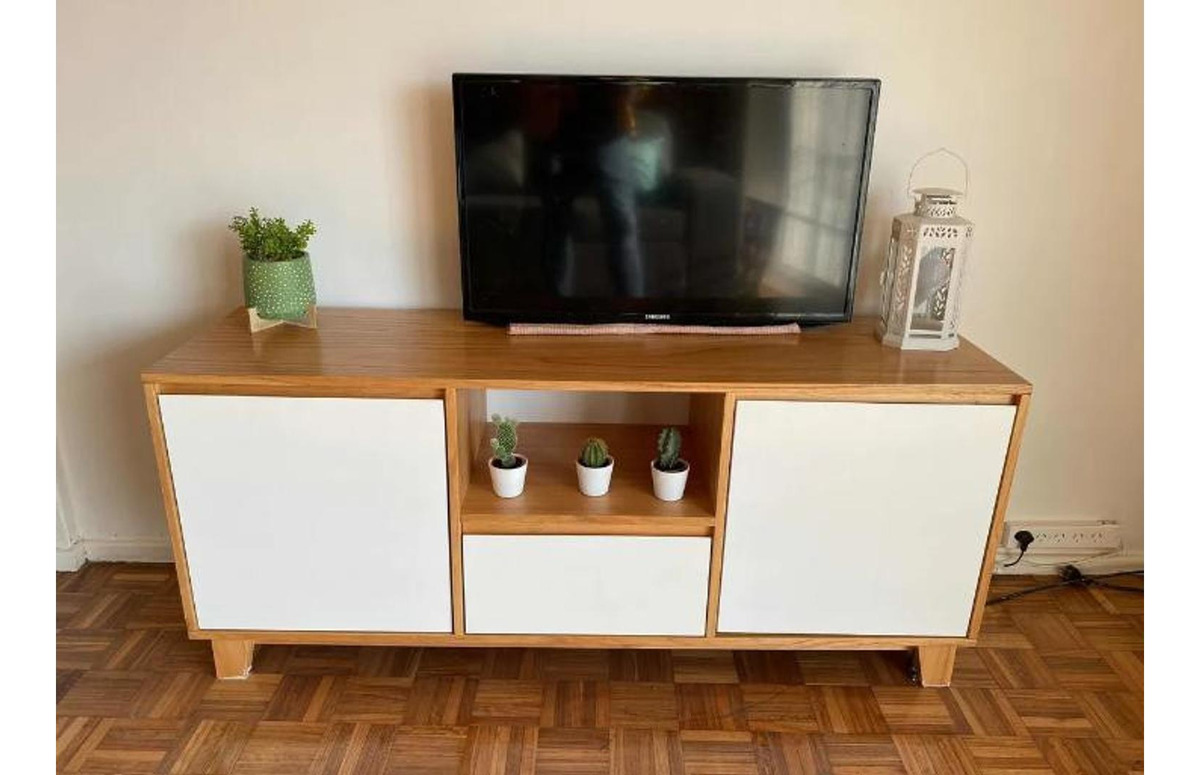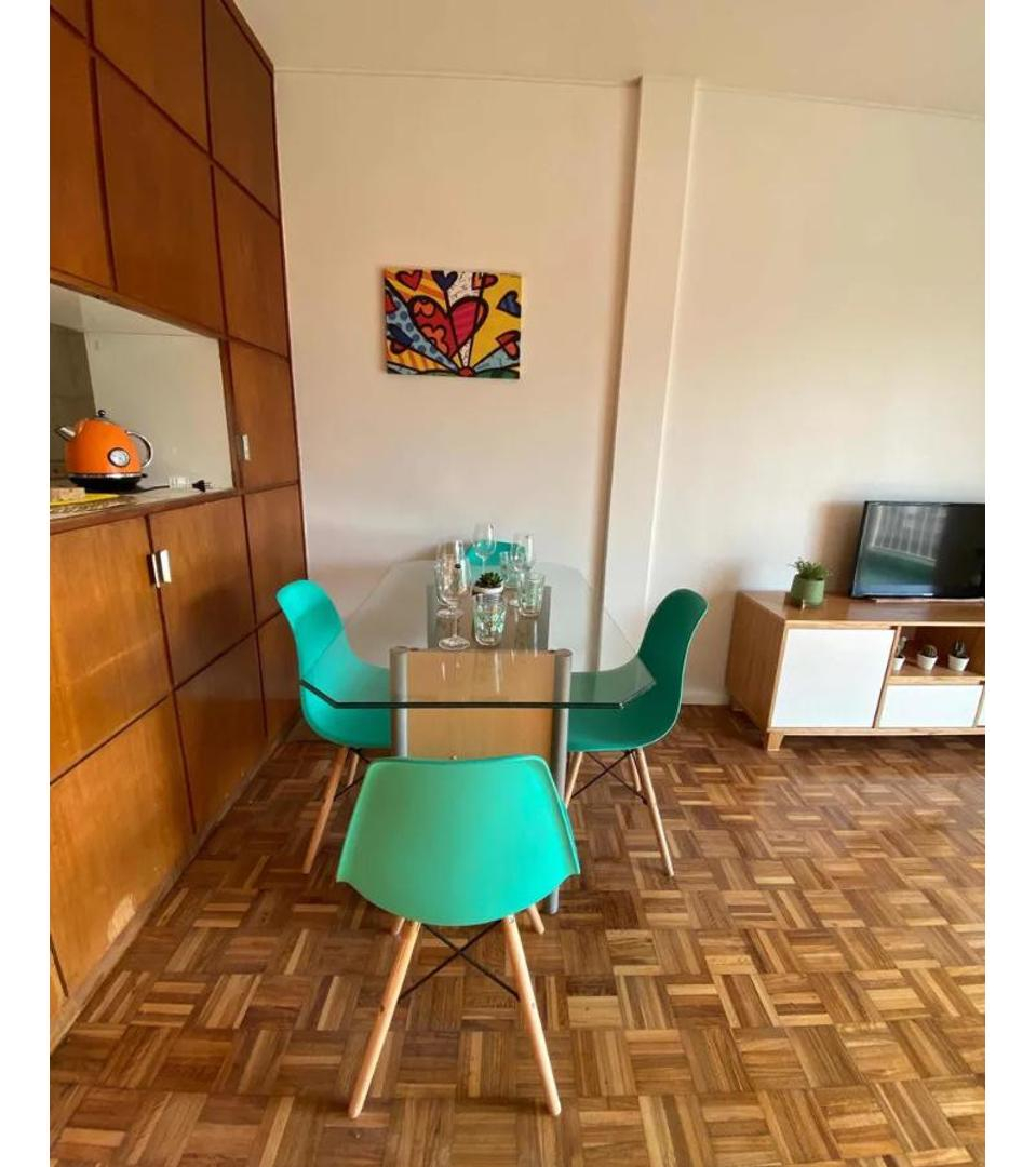 Mesa con 4 sillas , cocina , heladera, tv, pava eléctrica.