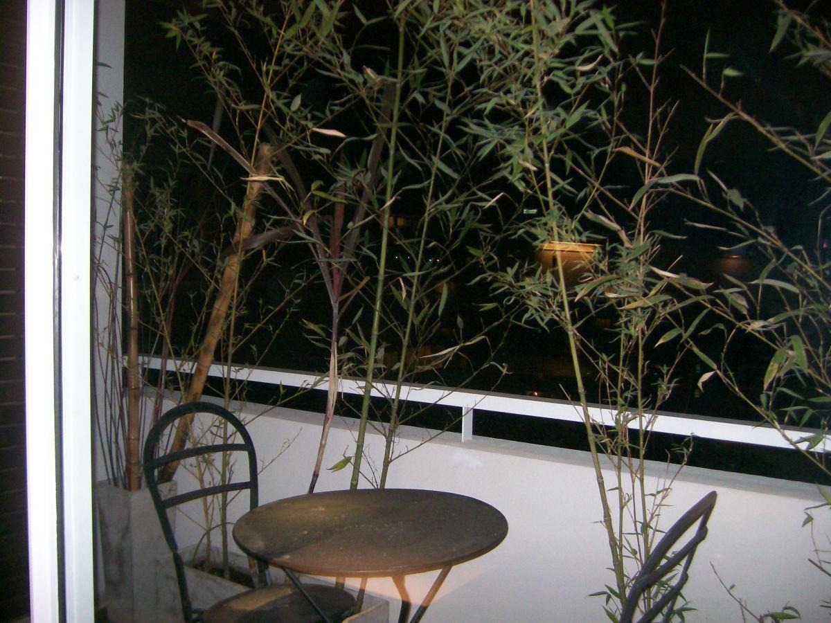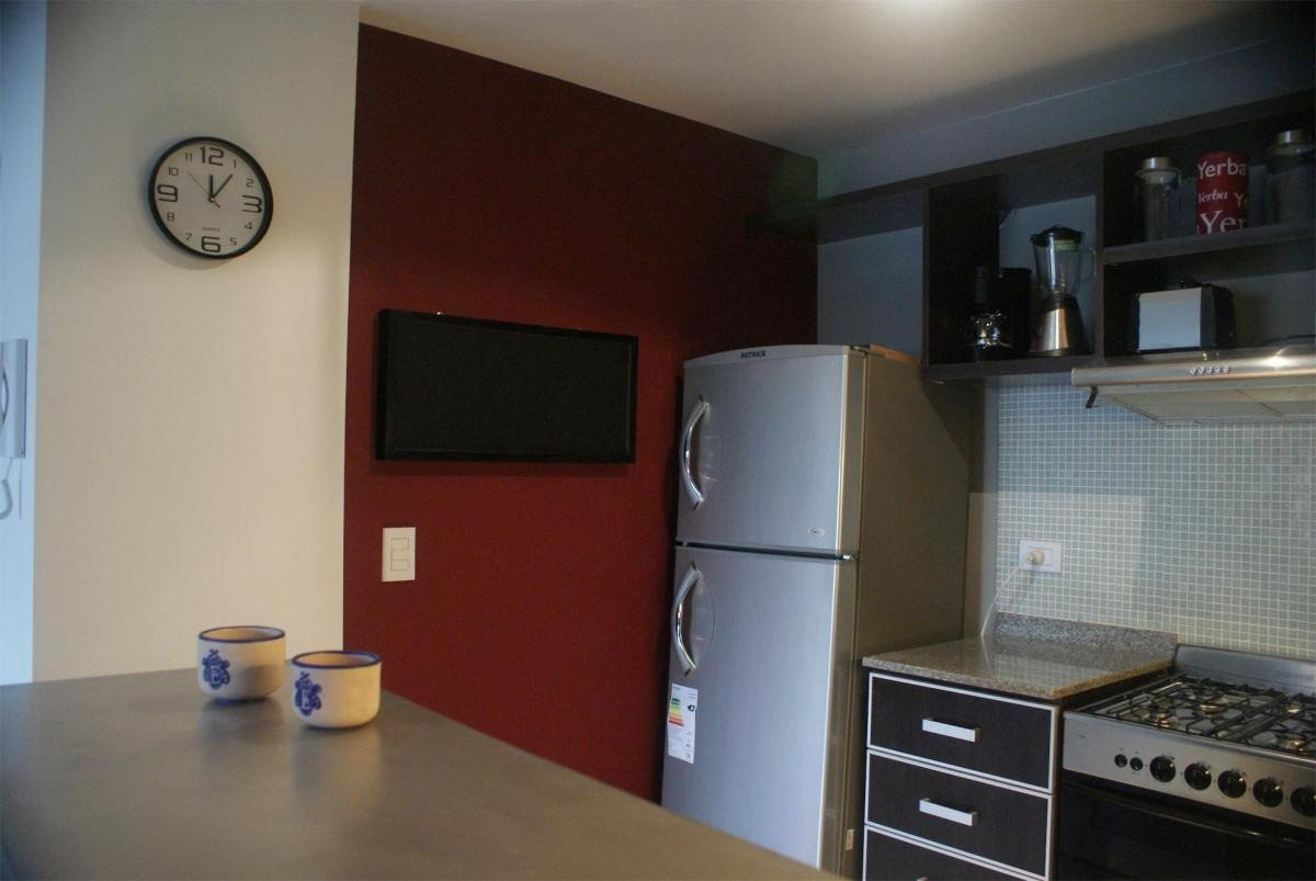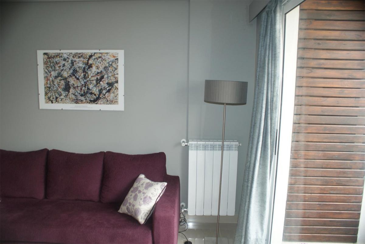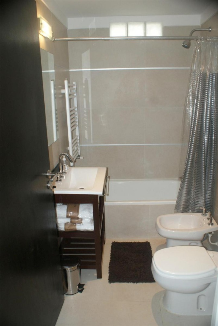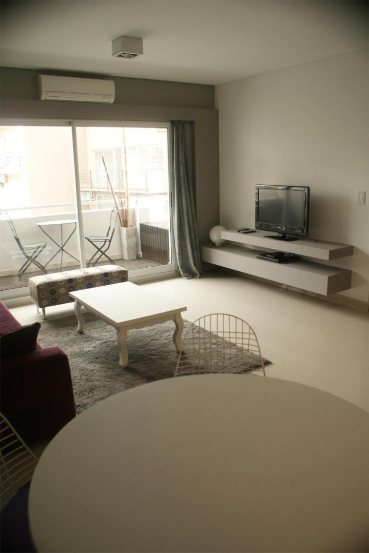 Departamento muy luminoso en piso alto. Tiene un balcón con plantas y mesa con sillas. La cocina está completamente equipada con heladera con freezer, cocina a gas, electrodomésticos, utensilios de cocina y vajilla. El living comedor cuenta con sofá, mesa de comedor con sillas, mesas de apoyo, TV Led y aire acondicionado. El dormitorio cuenta con cama tamaño matrimonial, mesas de luz, placards grandes, otra TV Led, y otro aire acondicionado. El baño es completo con bañera.