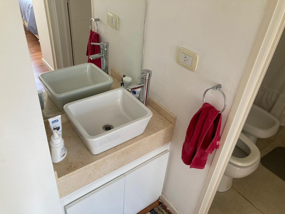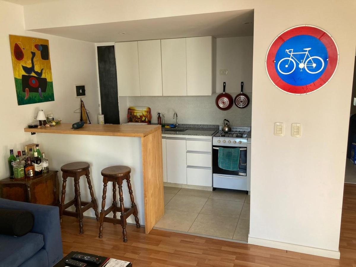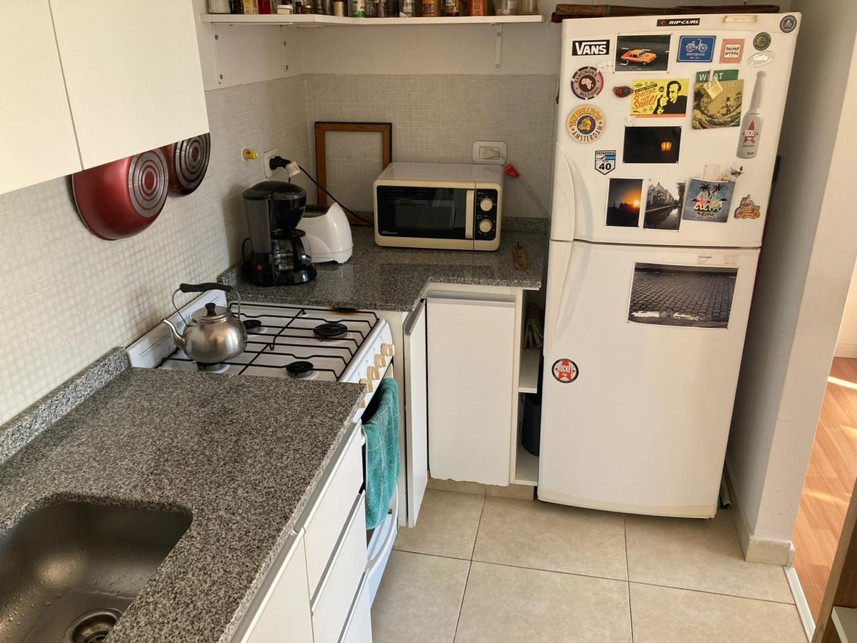 Cocina integrada con barra, bajo mesada y alacena completos, lavarropas, vajilla completa, horno y anafes a gas, cafetera, microondas.