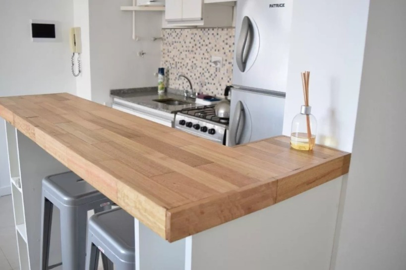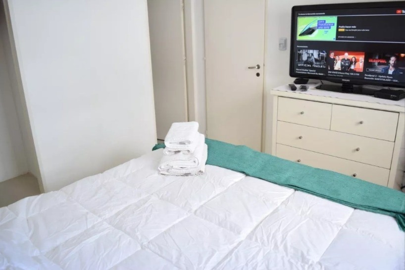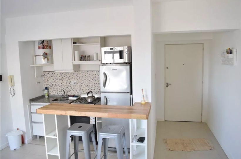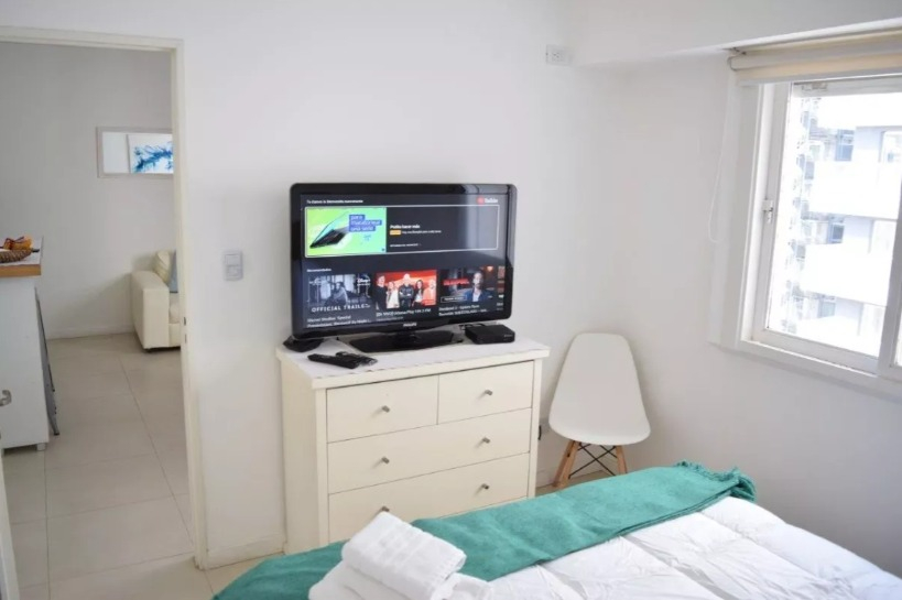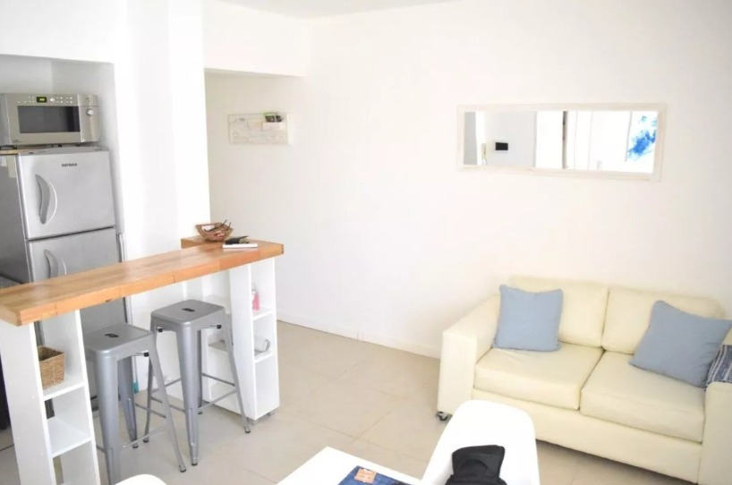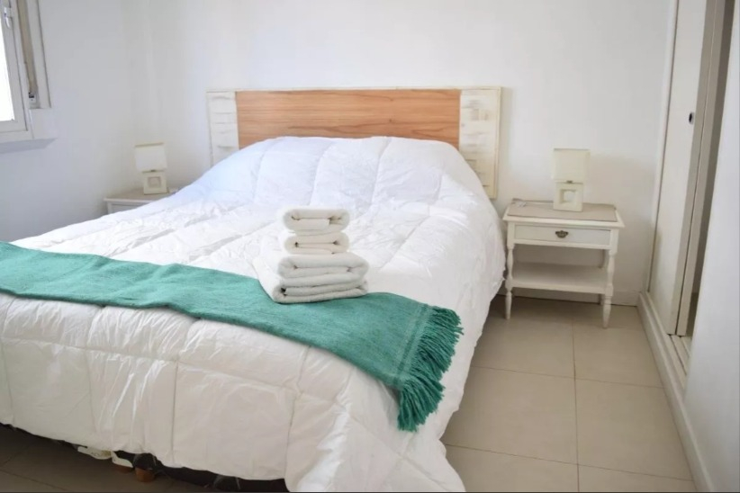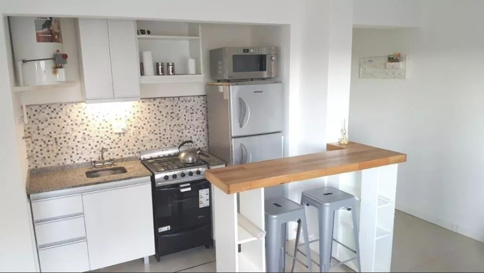 La cocina está totalmente equipada con microondas, heladera con freezer, horno, cafetera, pava eléctrica, tostadora, vajilla completa. El espacio es muy cómodo para cocinar a gusto, desayunar por la mañana en la barra con la luz del día o disfrutar de un rico almuerzo en la mesa junto a la ventana. Sofá de 2 plazas para relajarse, aire frío/calor para ambientar el espacio. Dormitorio muy confortable con un estupendo sommier queen size de 1.90x1.60 de resortes con sus respectivas mesas de luz, gran ventana para permitir la entrada de luz natural y ventilación, ventilador de techo, televisor led 43', Wifi, ropa de cama y baño. Espacios de guardado en el placard, mueble, mesitas. Baño en suite completo y moderno con secador de pelo, espejo con luz led y ducha con mampara de vidrio.