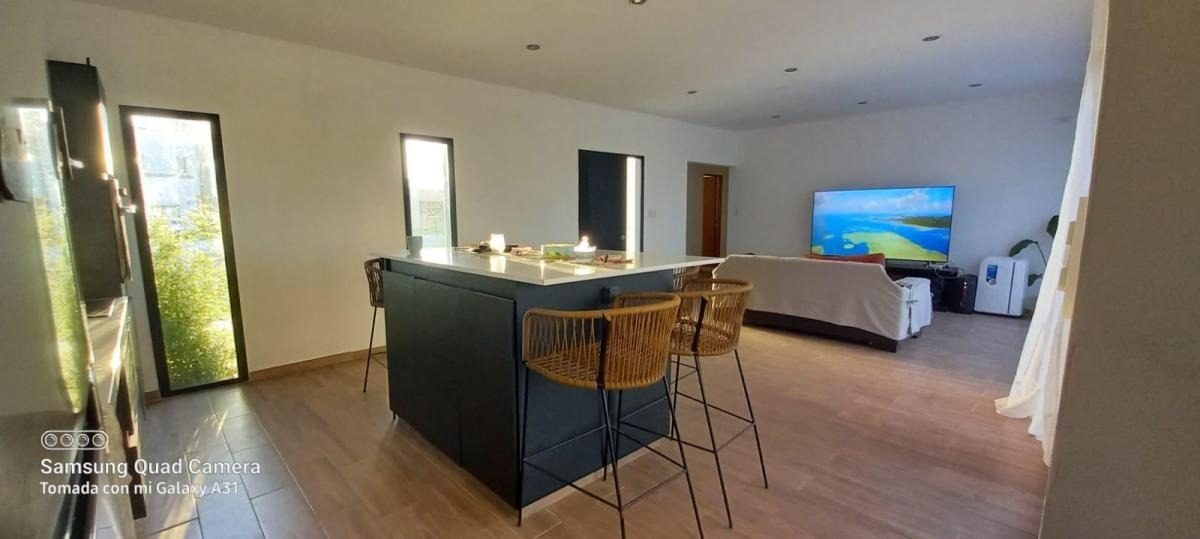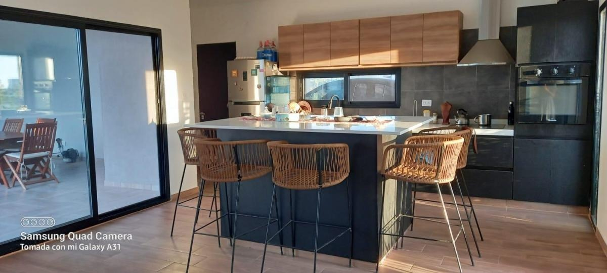 Amplia cocina con mesada e isla de silestone de 1era, bajo mesada y alacenas, conexión para lavavajillas, cocina táctil y horno eléctrico modernos.