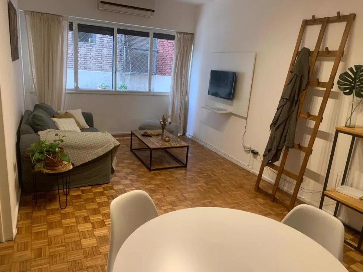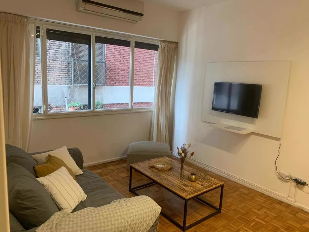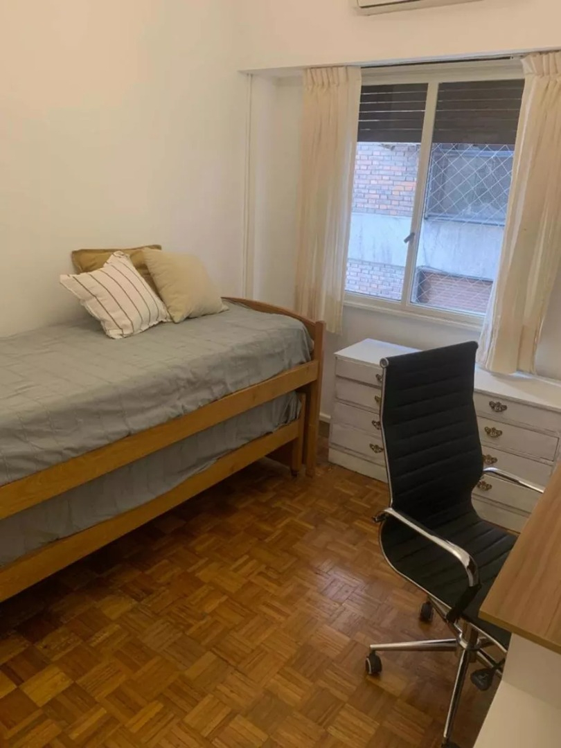 El departamento cuenta con ventanas en todos los ambientes y aires acondicionados. La cocina está separada, amoblada con estantes y bajo mesada, y completamente equipada con heladera con frizzer, cocina a gas, microondas, electrodomésticos, utensilios de cocina y vajilla. El área del living comedor cuenta con sofá, mesas, un puff y TV led; hay una mesa de comedor con cuatro sillas. Tiene una amplia ventana a lo largo de toda la pared. El dormitorio principal cuenta con dos camas de una plaza, que pueden juntarse logrando una cama de dos plazas. La segunda habitación tiene camas tipo nido, para dos personas; tiene también un escritorio con silla de escritorio y una cajonera. El baño es completo con bañera.