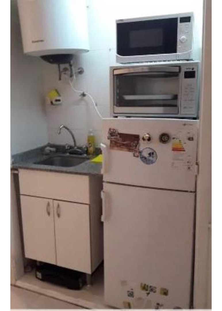 Bien distribuido, dividido perfectamente por un mueble de madera pintado en blanco y que parece parte del depto. el cuarto 3 x 3.5, el living 4 x 3.5, Baño 1.5 x 1.5. Cocina integrada (pero queda como en un pasillo por lo que no molesta ni se ve).