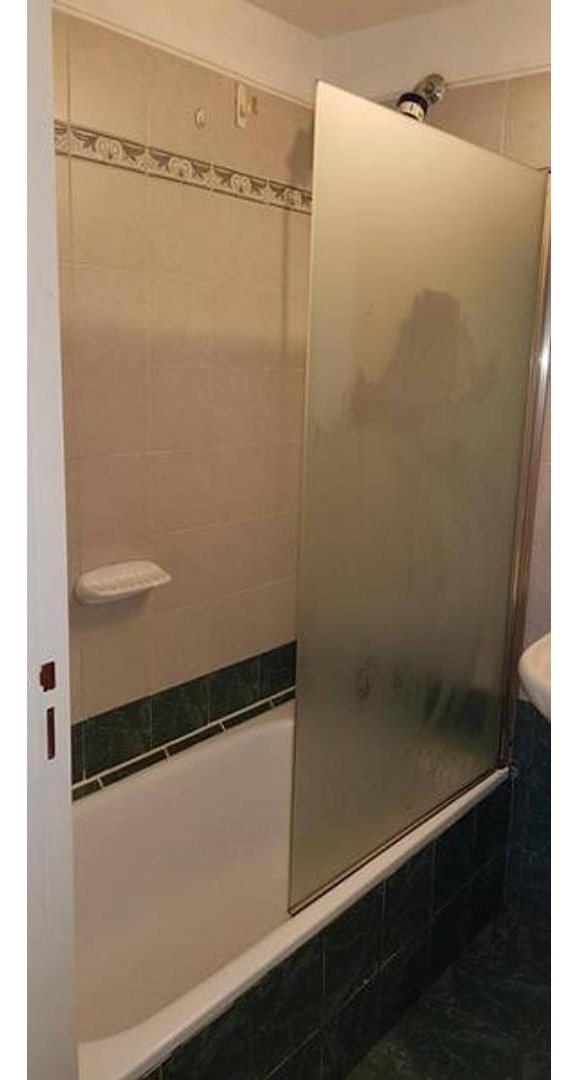 -Baño completo con bañera y mampara de vidrio templado y artefactos de primera. Placard doble puerta con cajonera.
