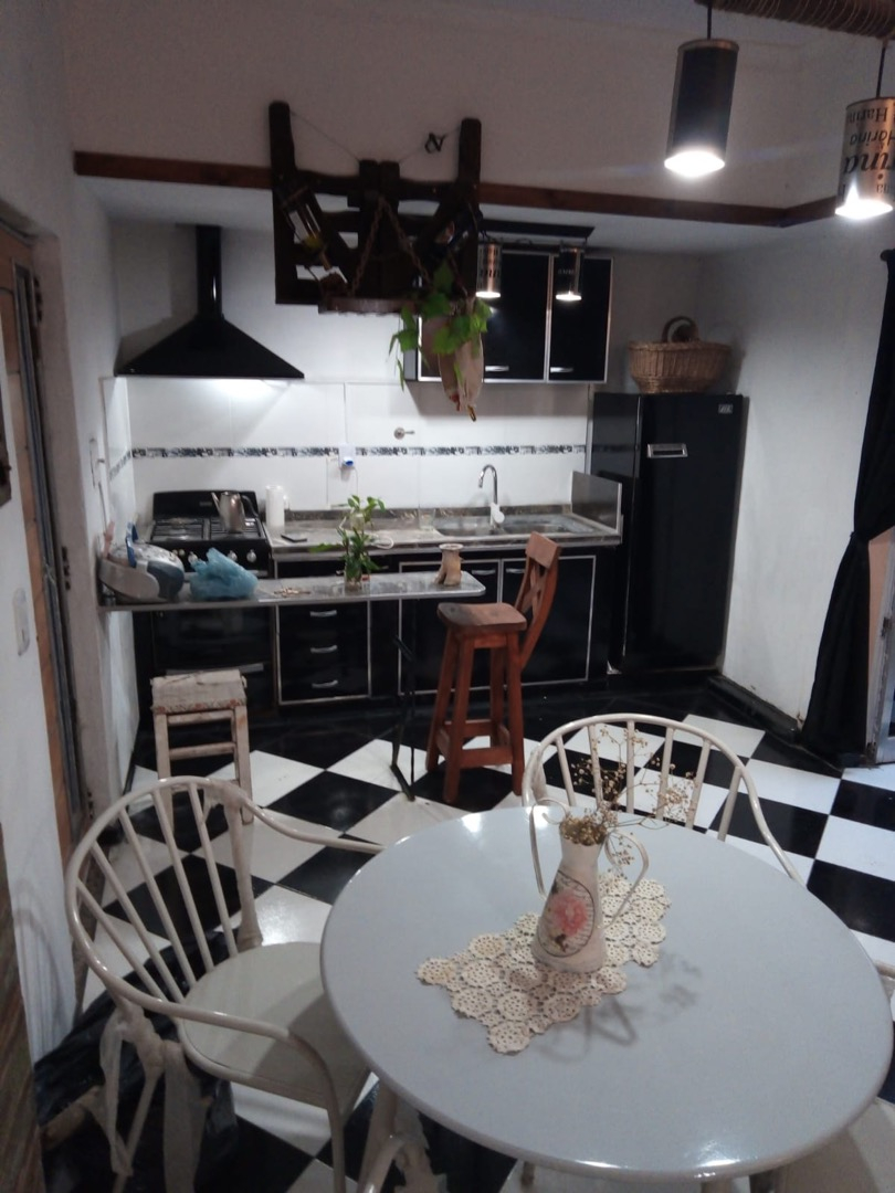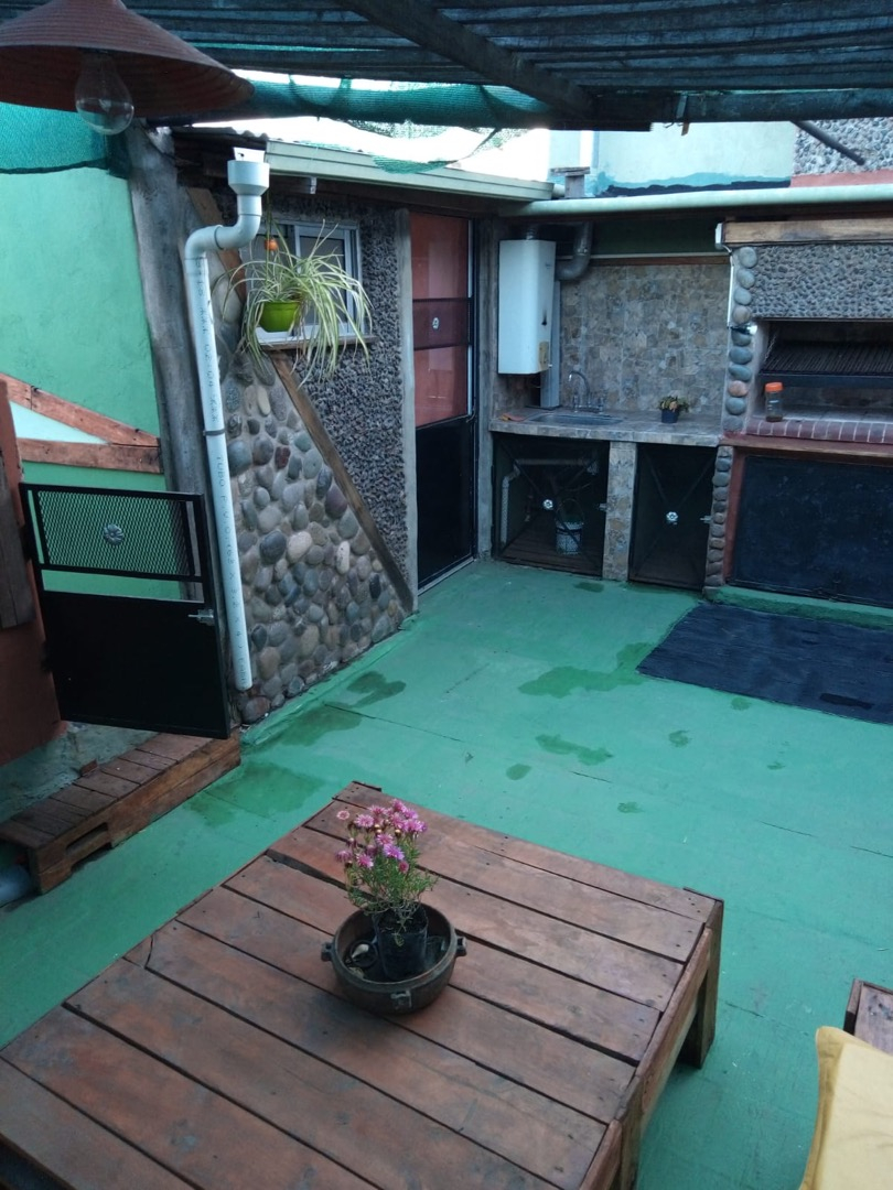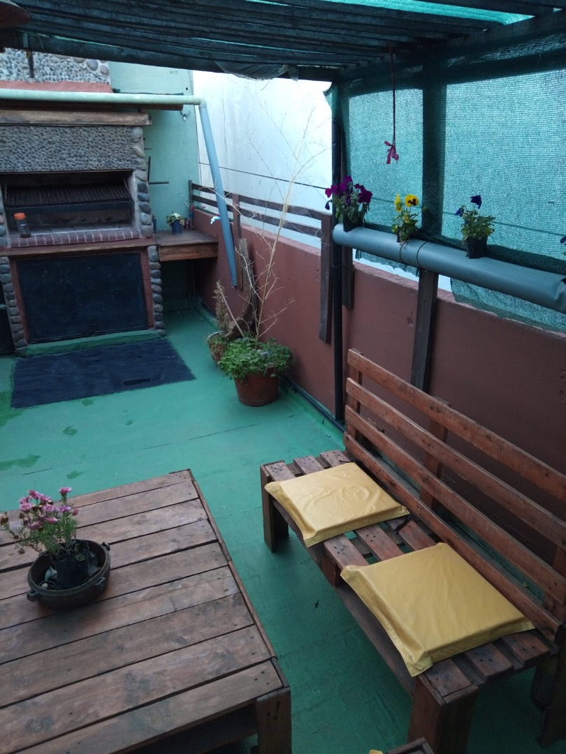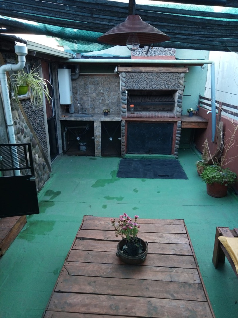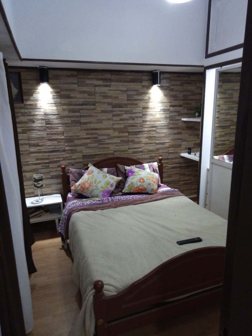 El departamento cuenta con: cocina- comedor, con pisos de cerámica, mesada de granito, bajo mesada, todo pintado de color blanco, living para sector de sillones, con mesa ratona. Habitación principal para cama matrimonial, una pared cuenta con decoración en pared con revestimiento símil piedra natural, con iluminación de dos porta luz, placar amurado a la pared con baulera, de color blanco. Baño principal con bidé, inodoro, con ducha movible, cortina de vidrio. Se ingresa al primer piso por escalera, que conecta al segundo dormitorio, que cuenta con baño privado, placard amurado a pared, pisos de cerámica color marrones con diseño, baño con ducha, lava manos. Patio con sector de parrilla ideal para agregarle sillones. Sector de lavadero con pileta.