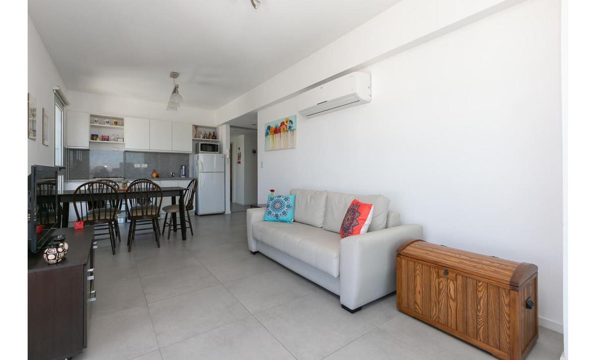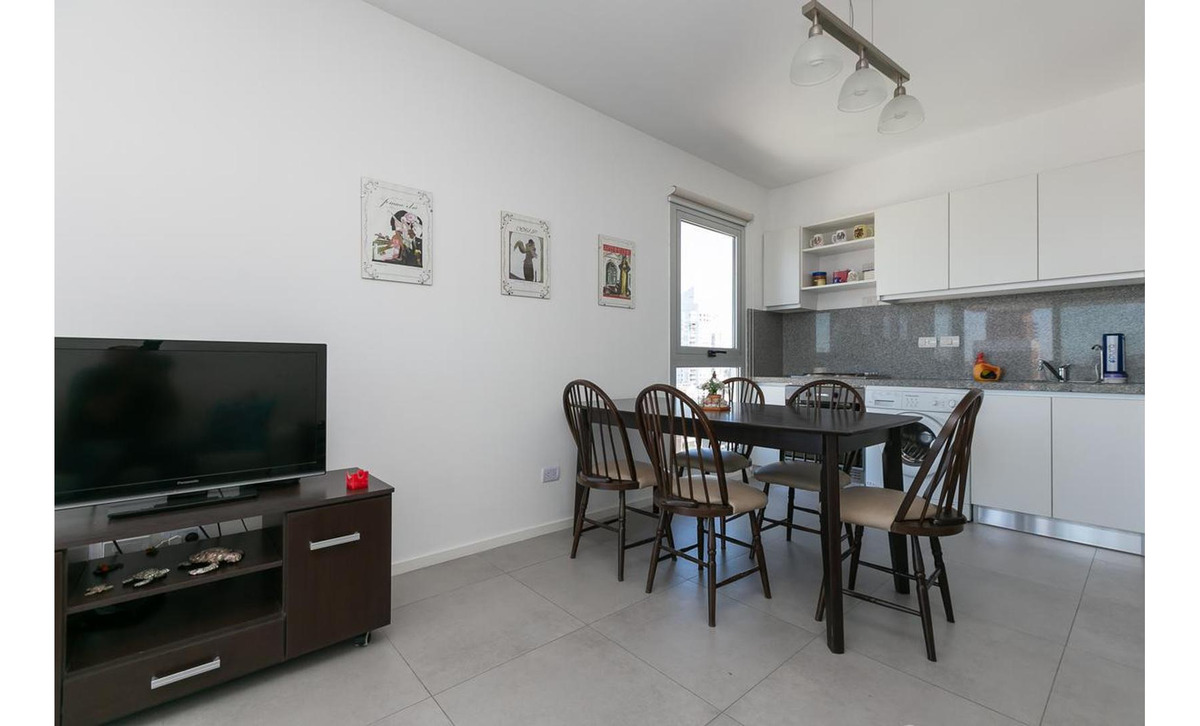 Living comedor integrado a la cocina, con vistas abiertas a la ciudad desde una altura increíble.