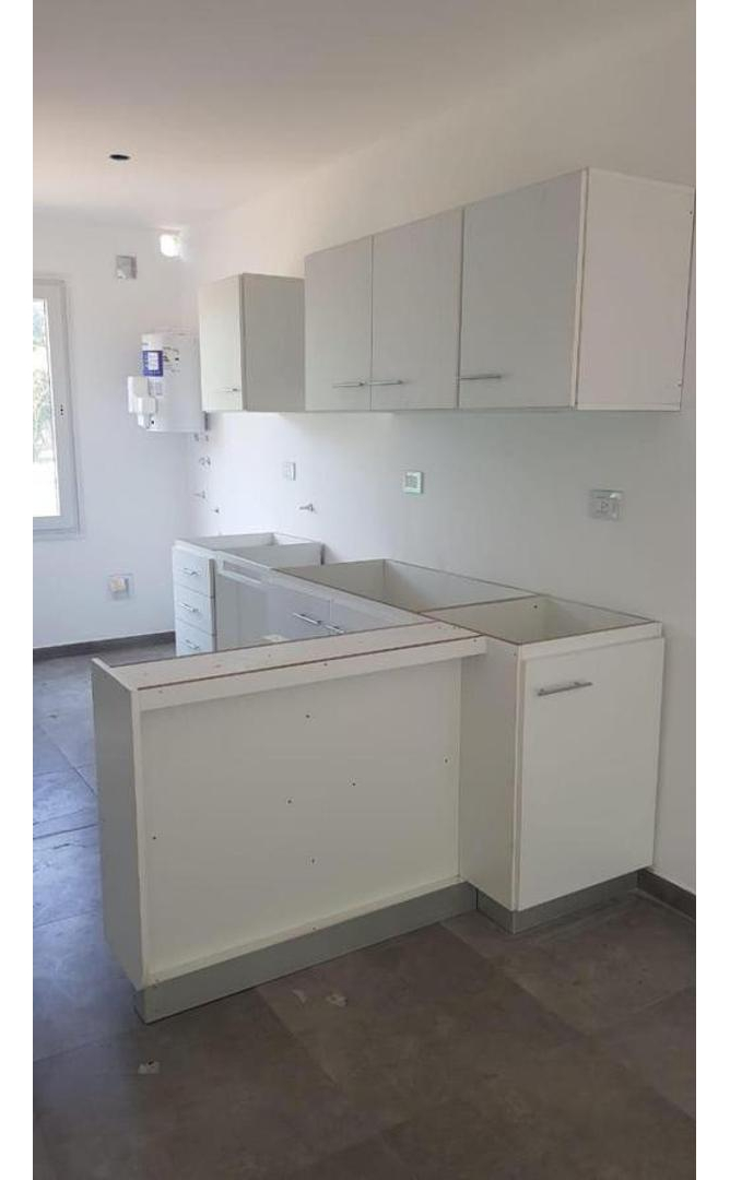 Muebles de cocina bajo mesada y alacena, realizados en melanina blanca con herrajes de aluminio y zócalos, con bacha doble.