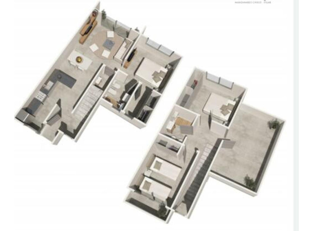 Planta alta: 2 dormitorios grandes, baño completo, balcón y terraza.