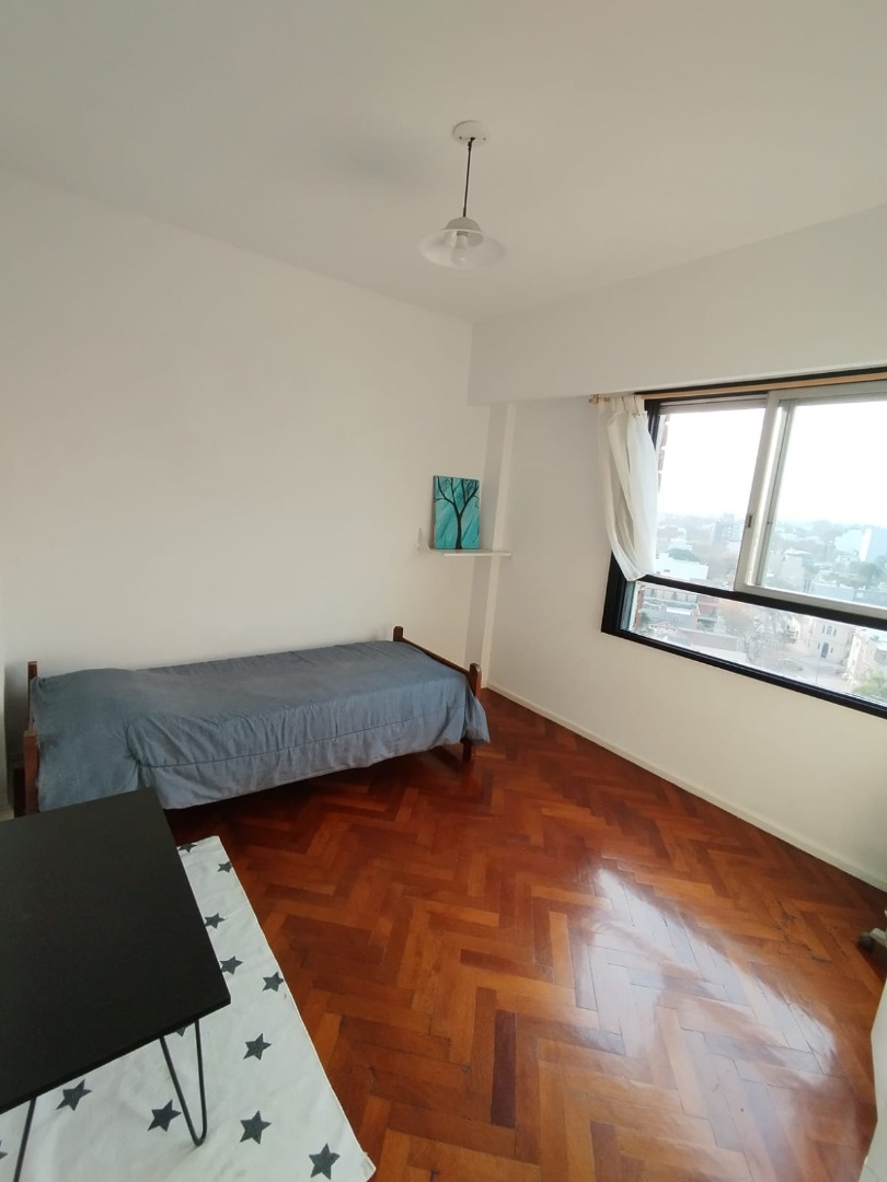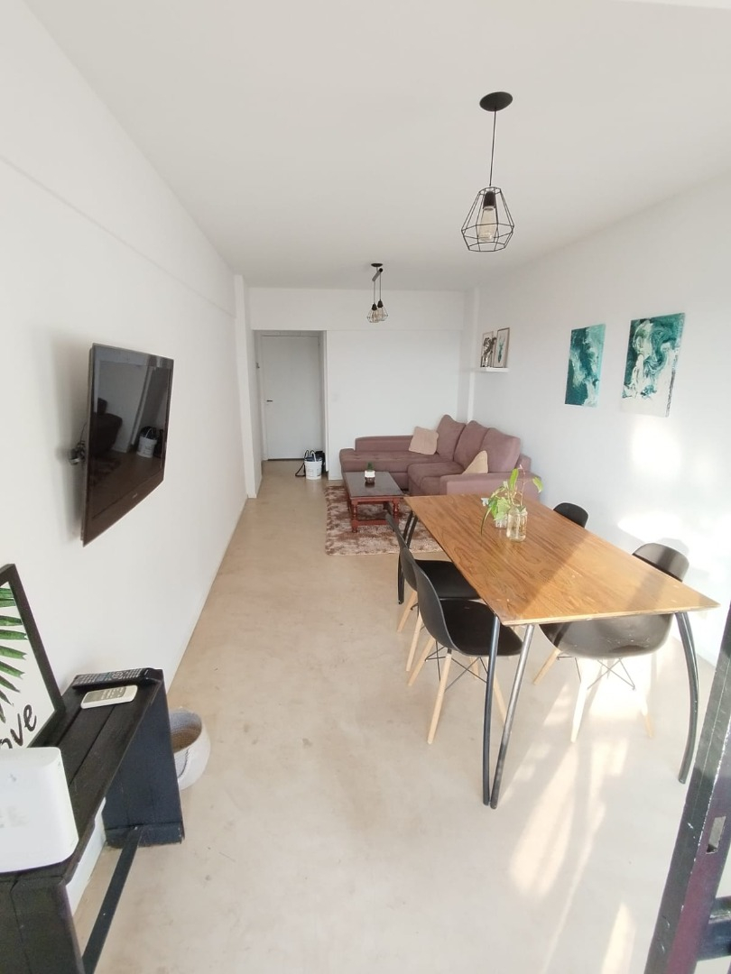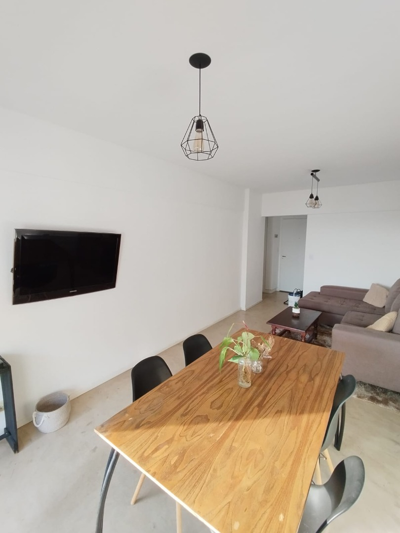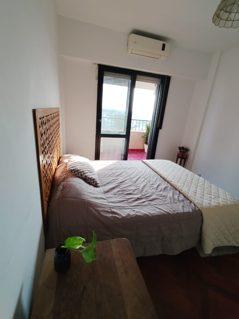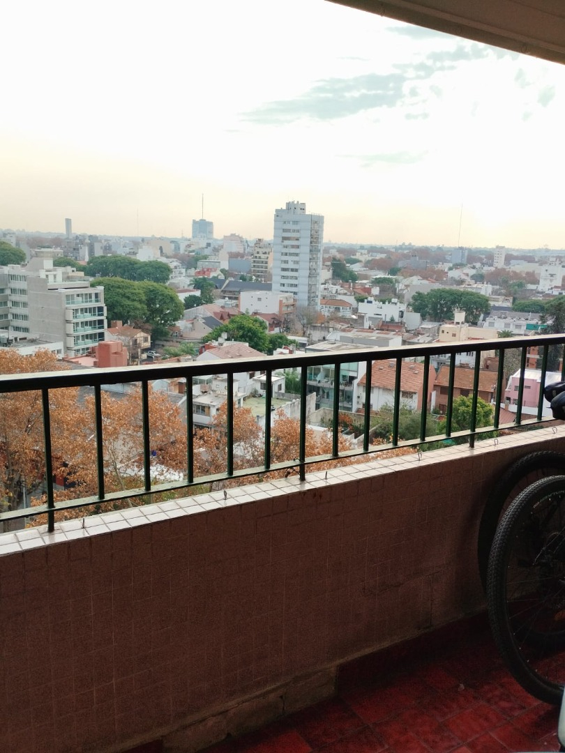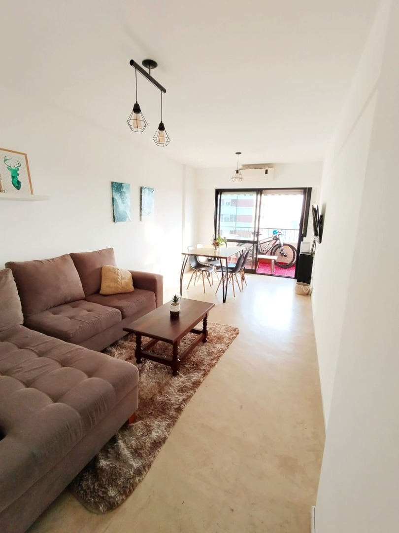 El departamento se ubica en el noveno piso, se ubica al frente, muy luminoso. Living-comedor luminoso con salida al balcón, con sofá en L tres cuerpos, y TV. Dormitorios con piso de madera y balcón. Baño con bañera, ducha, lavamanos con espejo e inodoro. Cocina con alacena, bajo mesada de granito, cuenta con heladera, cocina el electrodoméstico, y con comedor diario.