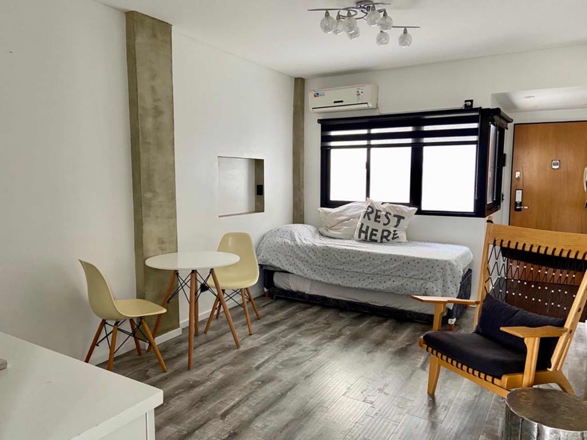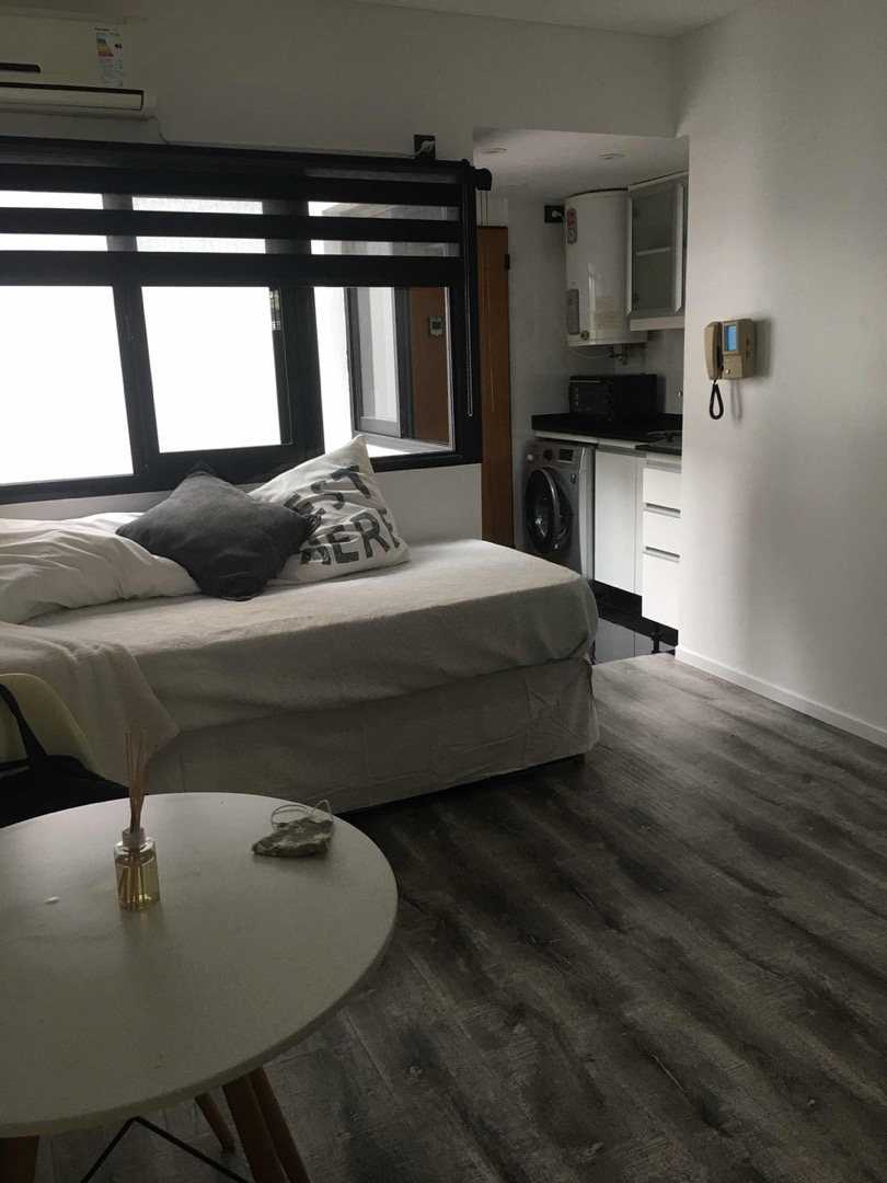 El departamento cuenta con habitación con cama, cocina con aire acondicionado, mesa y dos sillas, mueble de televisión, con Tv, cama doble.
