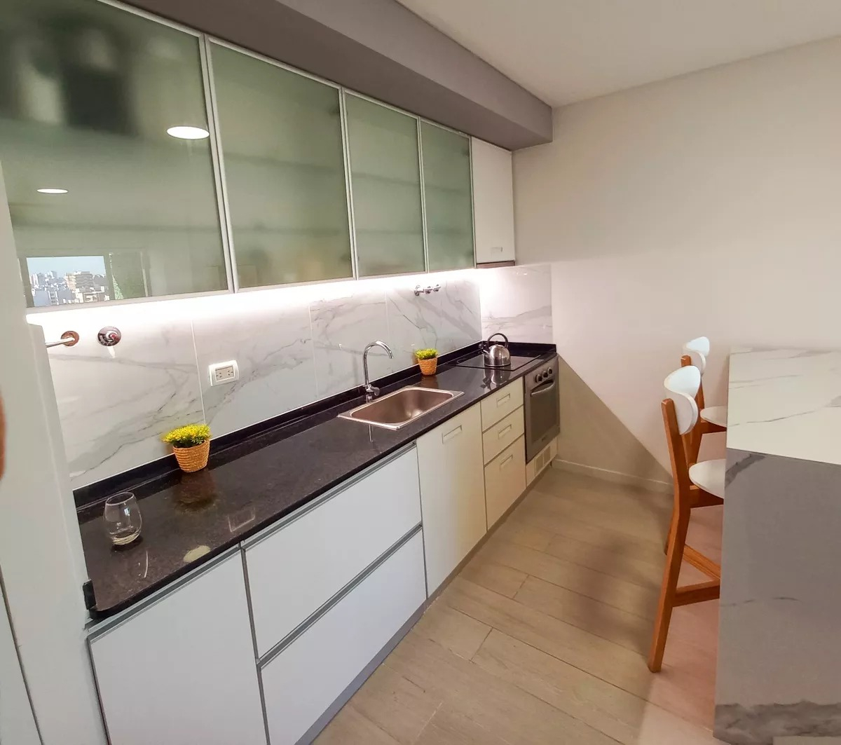 El departamento es amplio y moderno, tiene ventanas y ventanales que le aportan mucha iluminación natural. La cocina está amoblada con alacena y bajo mesada y está totalmente equipada con heladera con frizzer, anafe eléctrico, horno convector eléctrico, electrodomésticos, utensilios de cocina y vajilla. El área del living comedor cuenta con mesa alta con sillas, sofá, sillones, Tv led, aire acondicionado. Tiene ventanales con salida a un balcón amoblado con sillas. El dormitorio tiene una cama tamaño matrimonial con sus respectivas mesitas de luz, un espacioso placard empotrado con mucho espacio de guardado, y ventanas con cortinas blackout. El baño es completo con bañera con mampara de vidrio. Incluye ropa de cama y toallas.