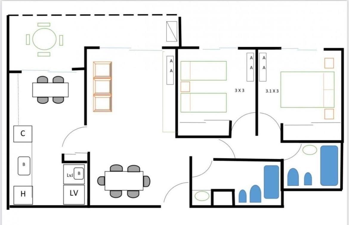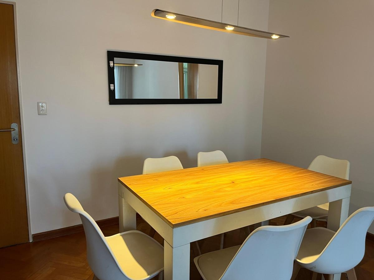 El departamento cuenta balcón corrido al frente, con red de protección para niños. Esta distribuido en: Living- comedor equipado con sillón, rack, TV, aire acondicionado, mesa y silla para 6 personas. Cocina equipada, con heladera con freezer, horno a gas, pequeños electrodomésticos, vajilla completa y utensilios de cocina, sector de comedor diario y sector lavadero con Lavarropas. Dos dormitorios, uno con cama doble y otro con 2 camas simples. 2 baños completos con bañera.