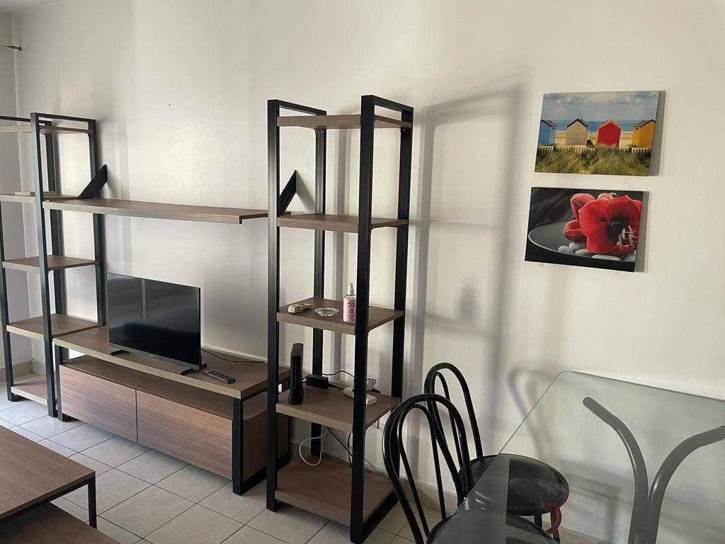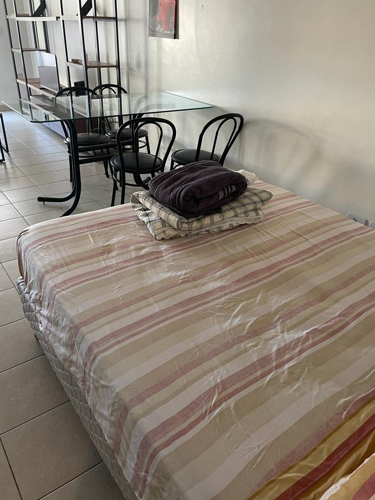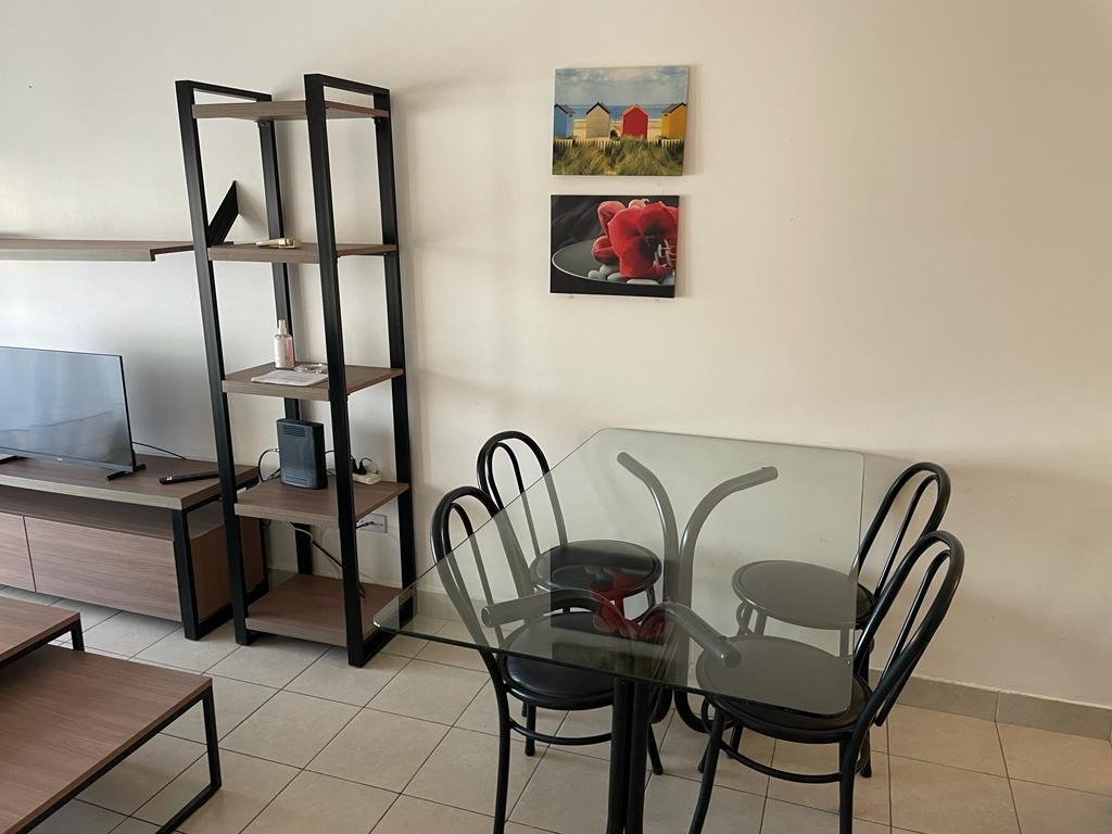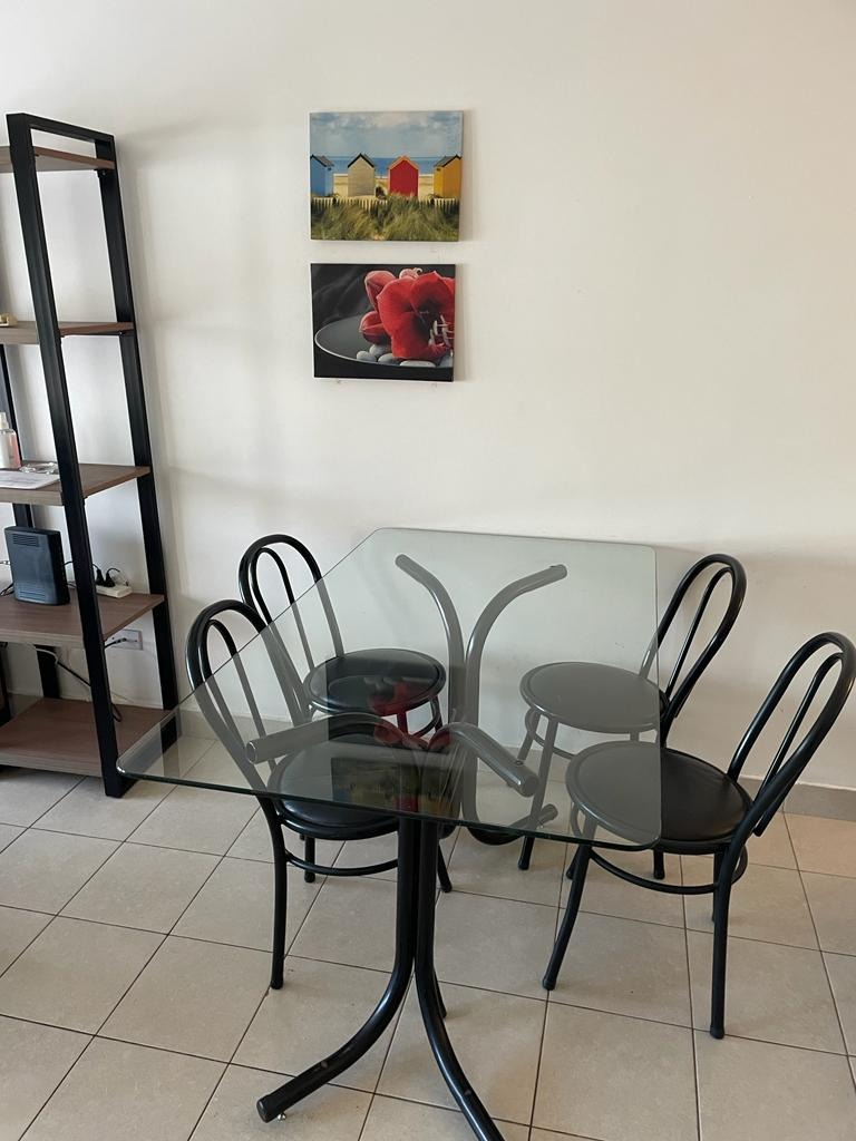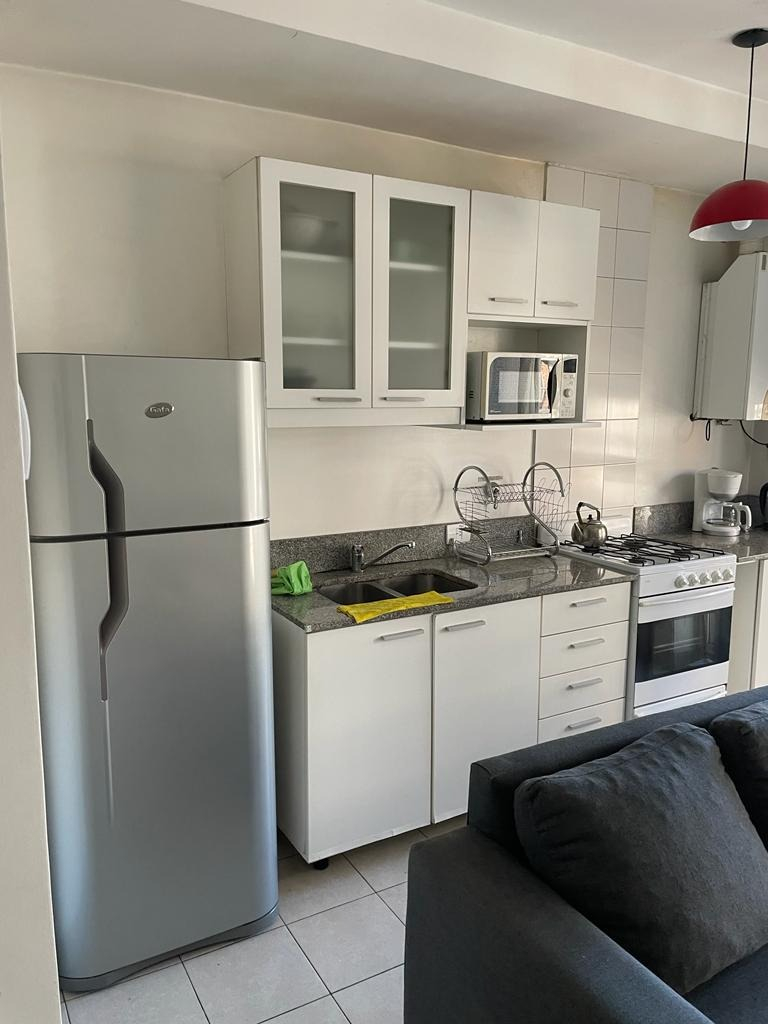 La cocina está amoblada con alacena y bajo mesada y completamente equipada con heladera con freezer, cocina a gas, electrodomésticos, utensilios de cocina y vajilla. Cuenta con mesa de comedor con sillas, sofá, biblioteca, TV led, mesas de apoyo.