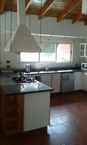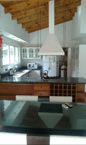 La cocina posee mesada de mármol de 3x2 metros en forma de L que sirve de barra desayunadora y facilita los usos y espacios para cocinar; horno y cocina empotrados de acero inoxidable, gran amueblamiento blanco de alacena y bajo mesada.