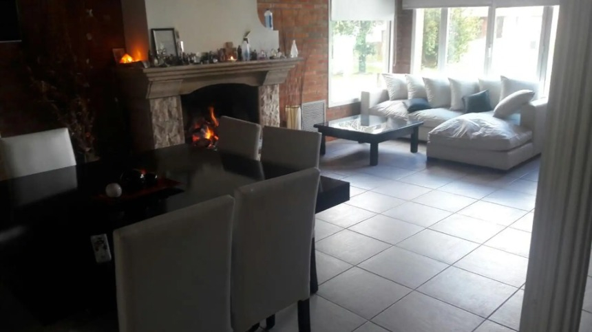 Al acceder descubrimos un ambiente grande y luminoso con un living de 8x5m2., mesa para 8 personas, sofá esquinero en L junto a los grandes ventanales y un hermoso hogar para contemplar la magia del fuego y ambientar el lugar.