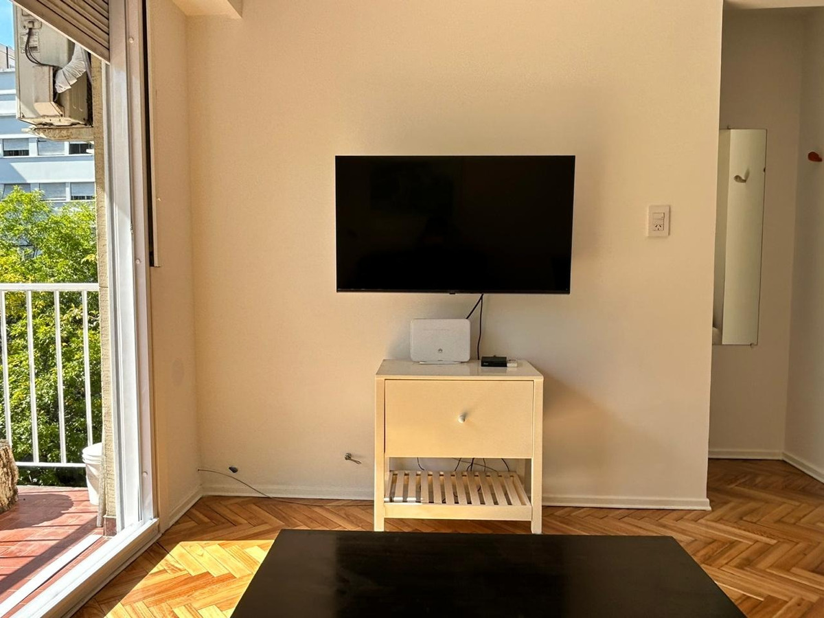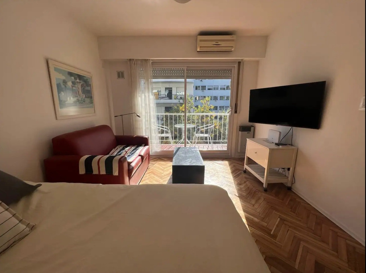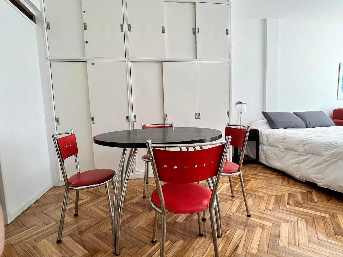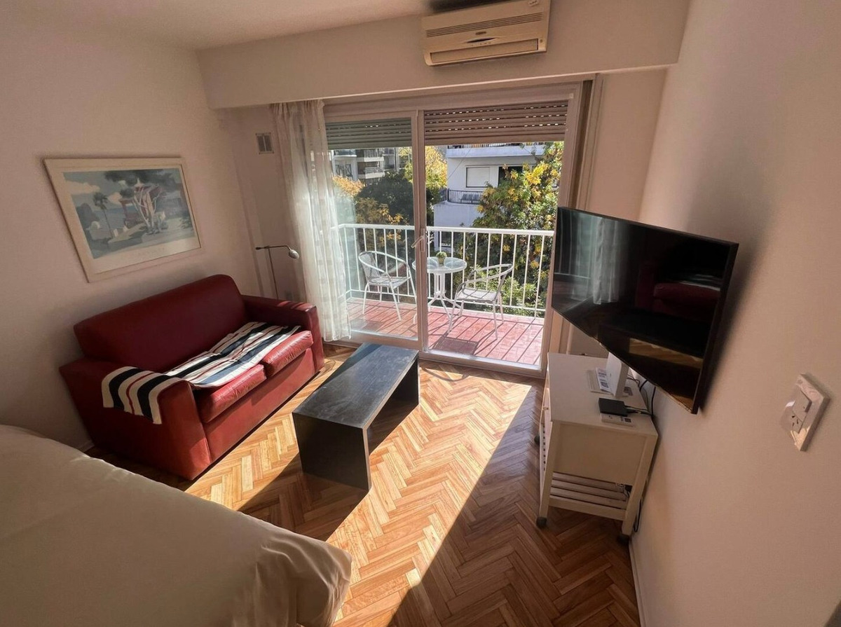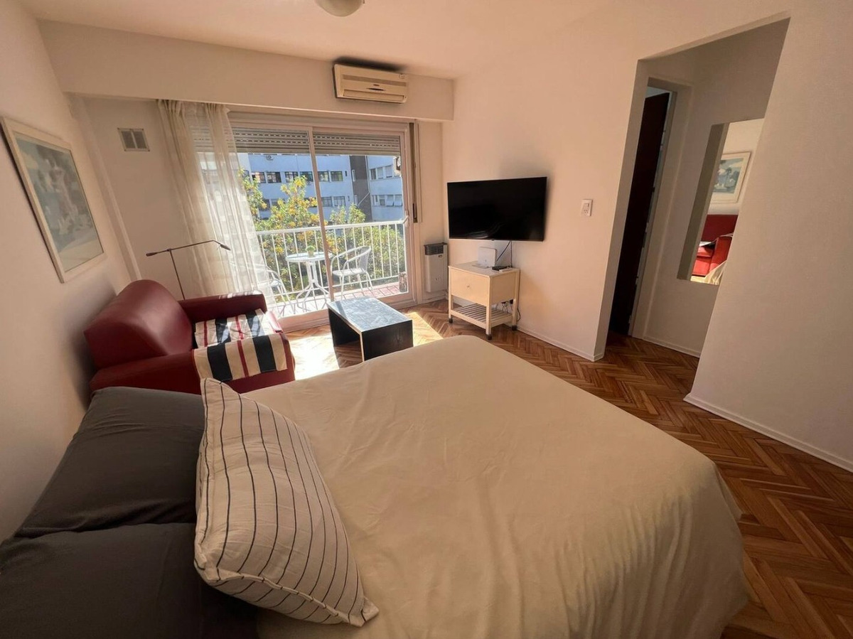 Departamento con balcón al frente, muy luminoso. El balcón tiene vidrio doble para un mejor aislamiento térmico. El ambiente principal se encuentra convenientemente amueblado para diferenciar 3 sectores: Sector con sofá cama, mesa baja y mueble con smart TV nueva de 42 pulgadas. En el medio Cama Queen c/ colchón nuevo y próximo a la cocina, el comedor con mesa y 4 sillas. Este ambiente, además, cuenta con un amplio placard de puertas corredizas y aire acondicionado. La cocina se encuentra separada mediante una división y esta equipada con horno a gas, extractor de aire, microondas, heladera con freezer, pequeños electrodomésticos, utensilios y vajilla. Tanto la cocina como el baño se encuentran recientemente acondicionados y el departamento recién pintado.