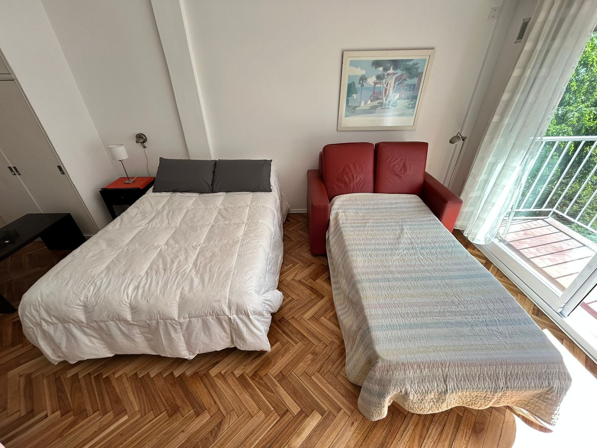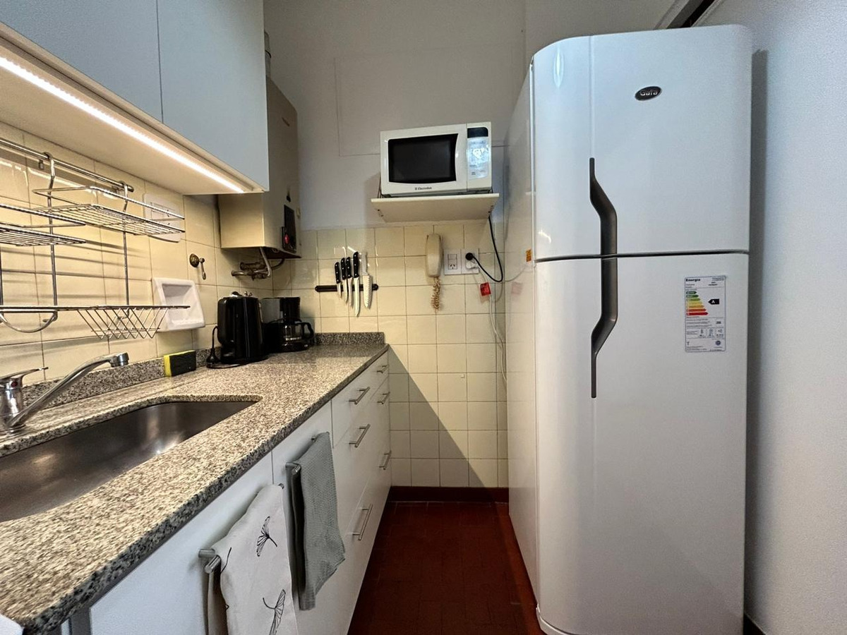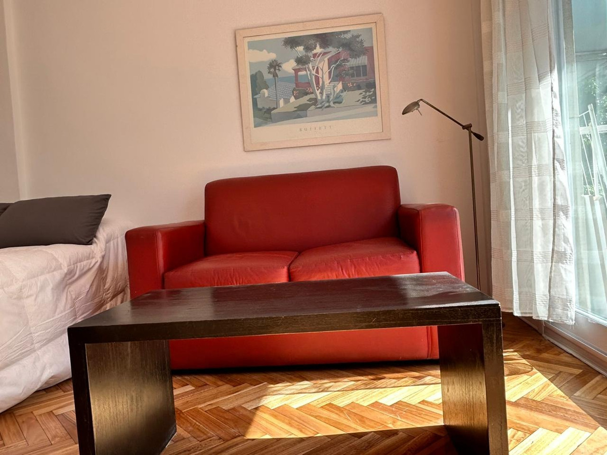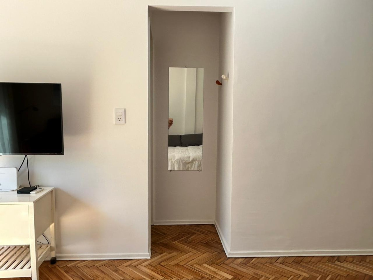 Departamento con balcón al frente, muy luminoso. El balcón tiene vidrio doble para un mejor aislamiento térmico. El ambiente principal se encuentra convenientemente amueblado para diferenciar 3 sectores: Sector con sofá cama, mesa baja y mueble con smart TV nueva de 42 pulgadas. En el medio Cama Queen c/ colchón nuevo y próximo a la cocina, el comedor con mesa y 4 sillas. Este ambiente, además, cuenta con un amplio placard de puertas corredizas y aire acondicionado. La cocina se encuentra separada mediante una división y esta equipada con horno a gas, extractor de aire, microondas, heladera con freezer, pequeños electrodomésticos, utensilios y vajilla. Tanto la cocina como el baño se encuentran recientemente acondicionados y el departamento recién pintado.