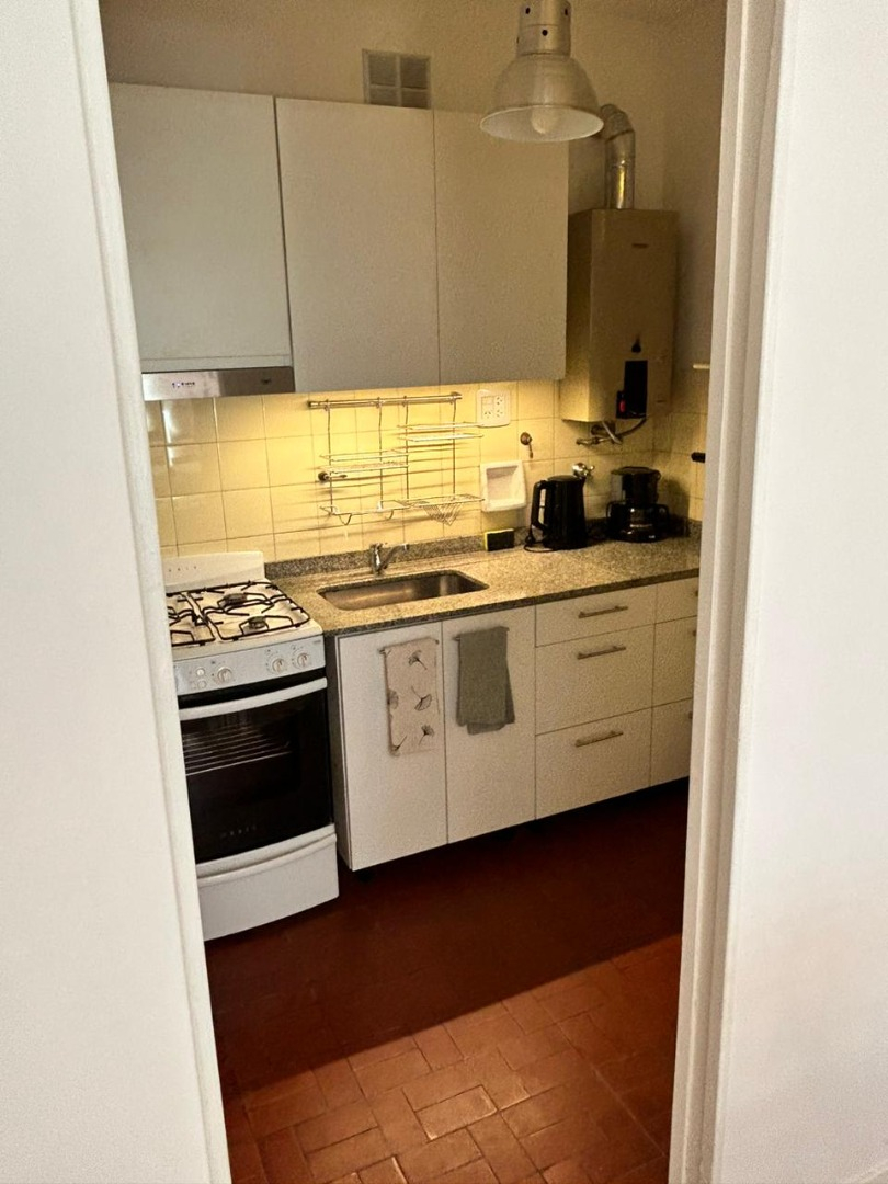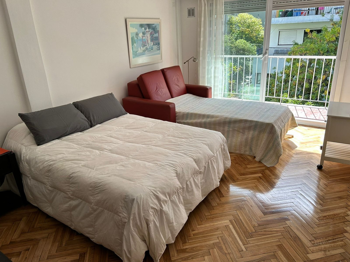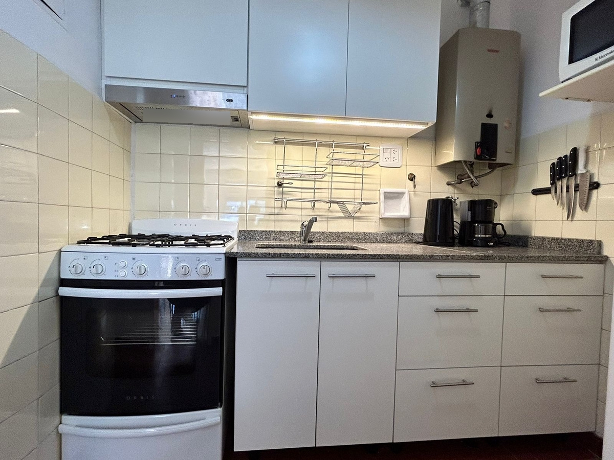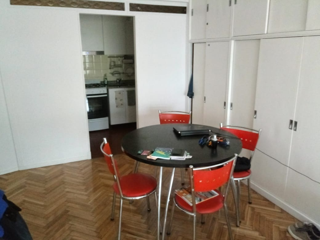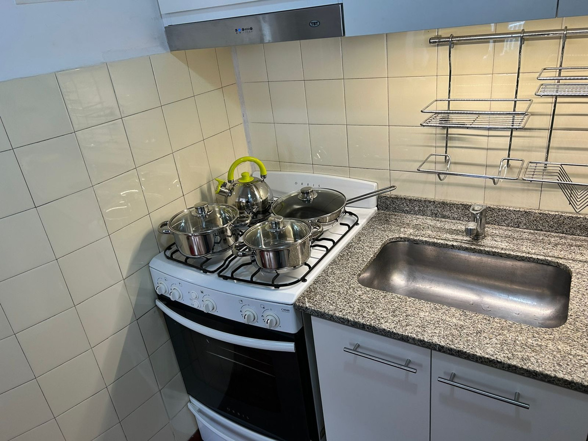 Departamento con balcón al frente, muy luminoso. El balcón tiene vidrio doble para un mejor aislamiento térmico. El ambiente principal se encuentra convenientemente amueblado para diferenciar 3 sectores: Sector con sofá cama, mesa baja y mueble con smart TV nueva de 42 pulgadas. En el medio Cama Queen c/ colchón nuevo y próximo a la cocina, el comedor con mesa y 4 sillas. Este ambiente, además, cuenta con un amplio placard de puertas corredizas y aire acondicionado. La cocina se encuentra separada mediante una división y esta equipada con horno a gas, extractor de aire, microondas, heladera con freezer, pequeños electrodomésticos, utensilios y vajilla. Tanto la cocina como el baño se encuentran recientemente acondicionados y el departamento recién pintado.