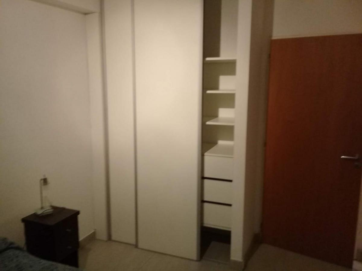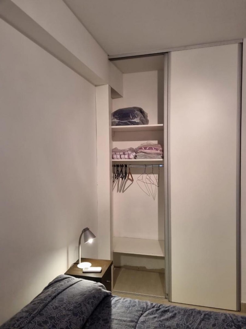 Habitación con cama matrimonial, con sabanas y almohadas, plancha, aire acondicionado, mesa de luz, placar de melanina.