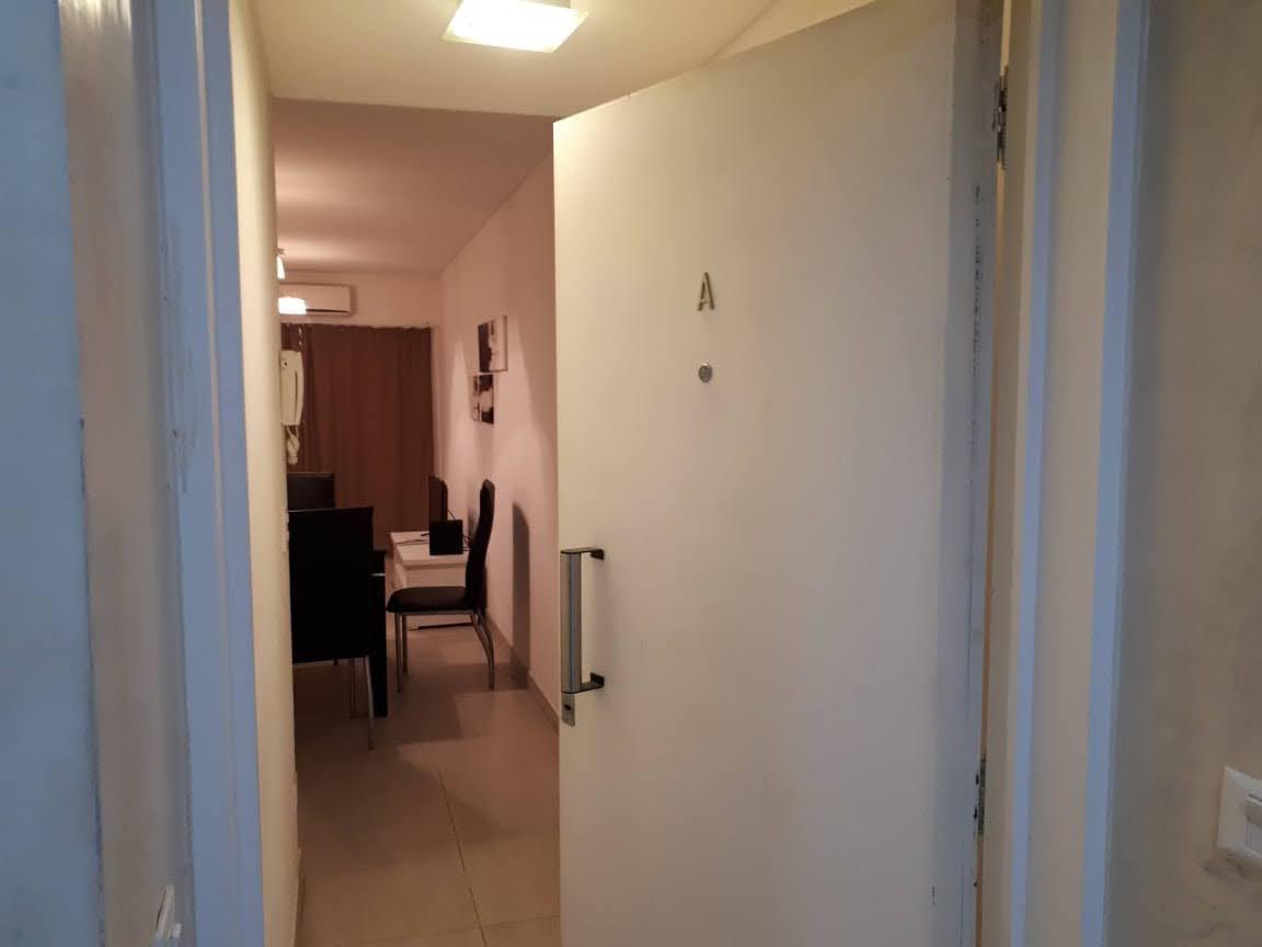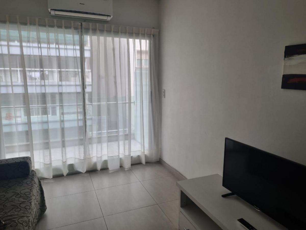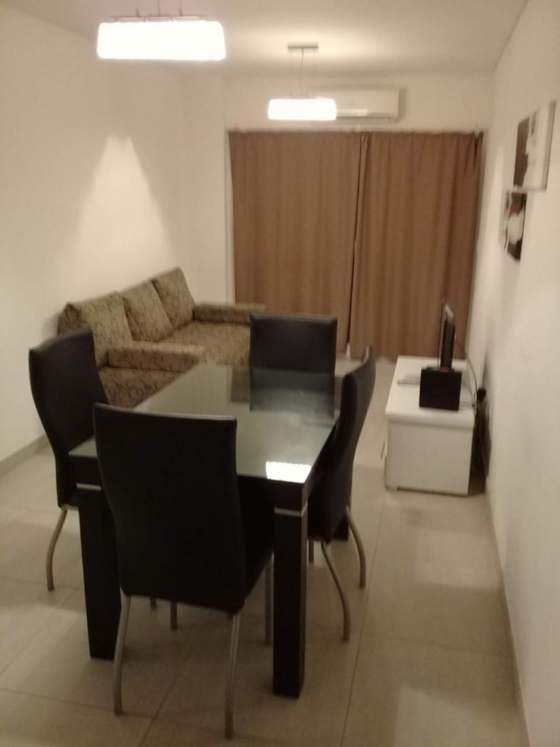 Al ingresar tenemos el Living con mesa, sillas, sillón, cortina, aire acondicionado, mueble para TV con tv, el living cuenta con salida al balcón.