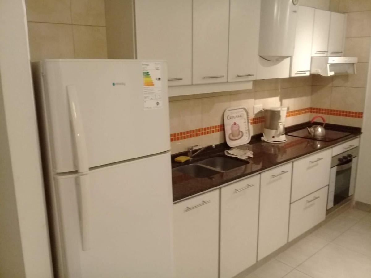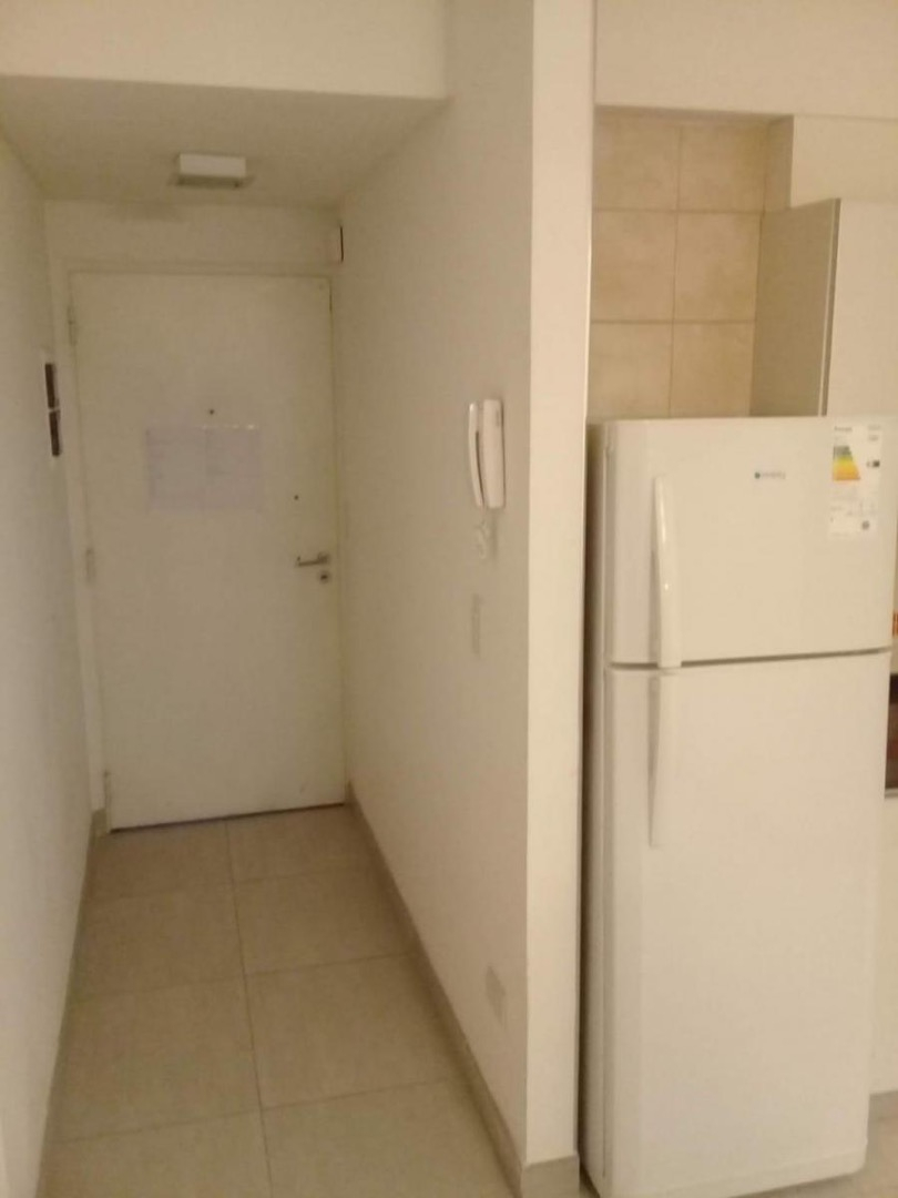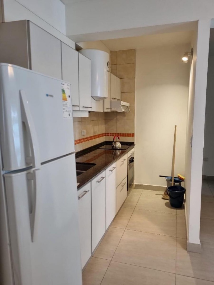 Cocina equipada con Cocina, Heladera, termotanque eléctrico, cafetera, alacena y bajo mesada de melanina color blanco.