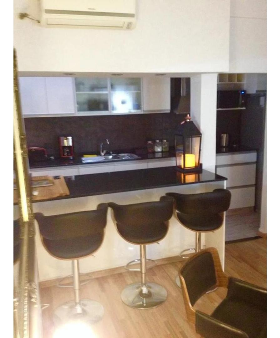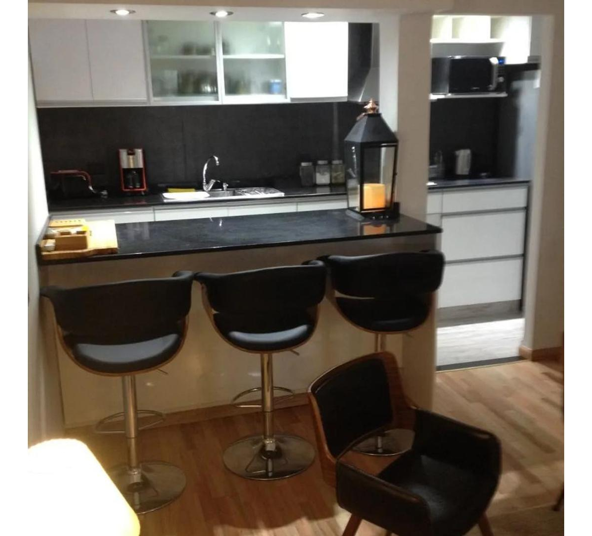 -Cocina totalmente equipada con microondas, heladera. Esta dividida por una barra desayunador con sus respectivas sillas