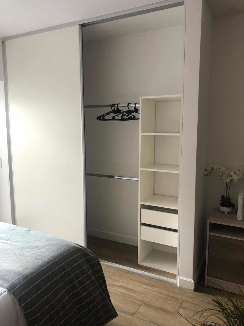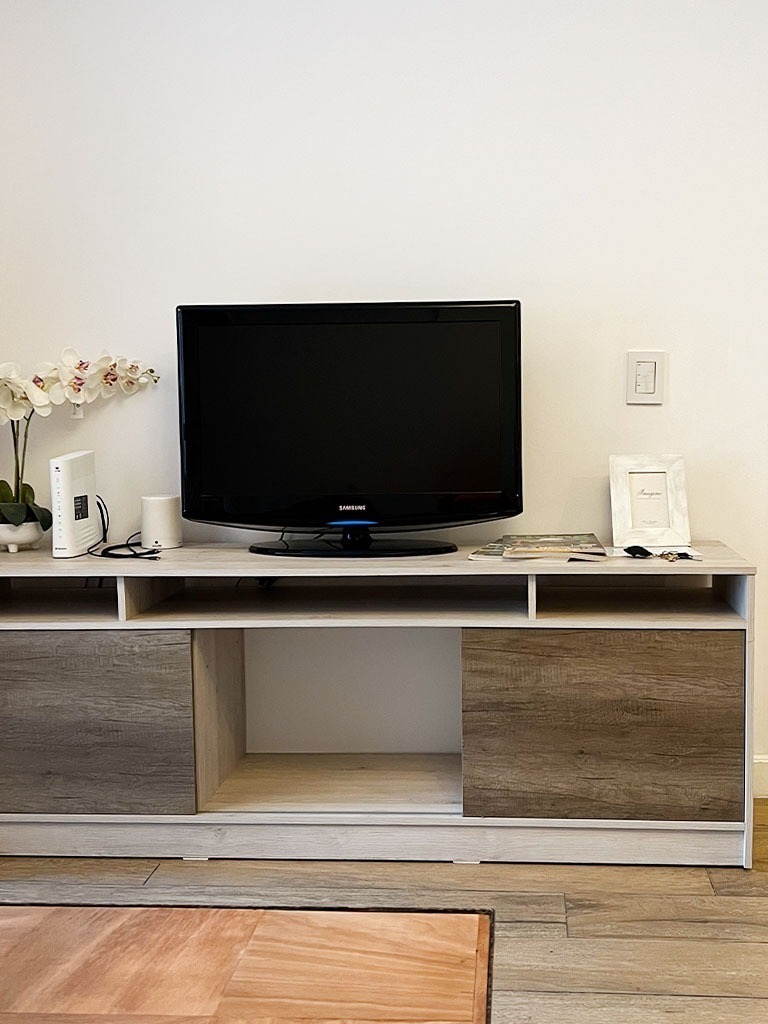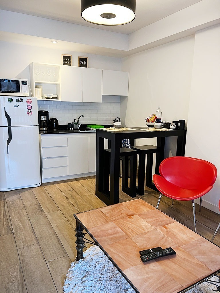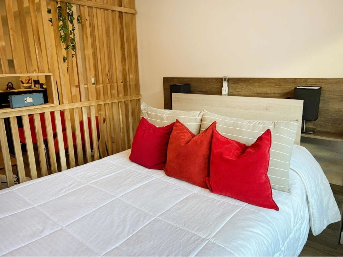 El departamento cuenta con monoambiente amplio, al ingresar se encuentra el sector de la cocina que tiene heladera, cocina con eléctrica de cuatro hornallas con horno, mesa desayunadora con dos banquetas, pava, microondas, cafeteras, alacena y bajo mesada, vajillas. Sector de living con mesa ratona con dos sillones, mesa de TV, con smart. Habitación subdividida con cama matrimonial con ropa de cama, sabanas, acolchados, almohadas, con aire acondicionado, placard de melanina grande. con salida al balcón. Baño con bidé, lava manos, con sus griferías. Balcon con juego de sillas y mesa. El departamento cuenta con cochera fija cubierta.
