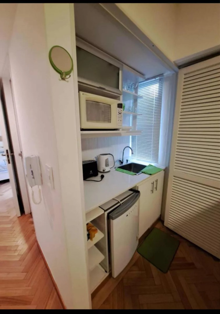 El departamento está ubicado en piso alto, con balcón francés con buenas vistas de la ciudad y el río. Kitchinette con heladera bajomesa, anafe eléctrico, microondas, jarra eléctrica, tostadora, vajilla y utensilios de cocina. Barra con 4 sillas, sofá. El dormitorio cuenta con dos sommiers individuales que pueden juntarse logrando una cama doble. Cuenta con aire acondicionado y TV Led. Placards en el pasillo con mucho espacio de guardado. Baño completo con ducha con mampara.