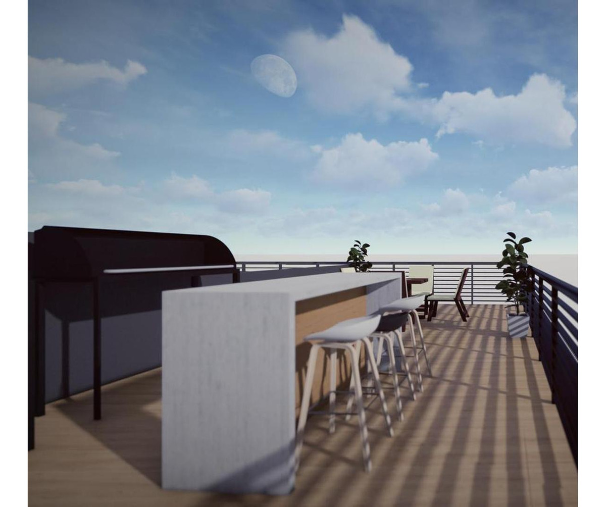 El complejo contará con una terraza de casi 40 m2 como espacio en común, enrejada por seguridad con piso de deck de madera, habrá un espacio techado con una parrilla y una pileta de uso común.