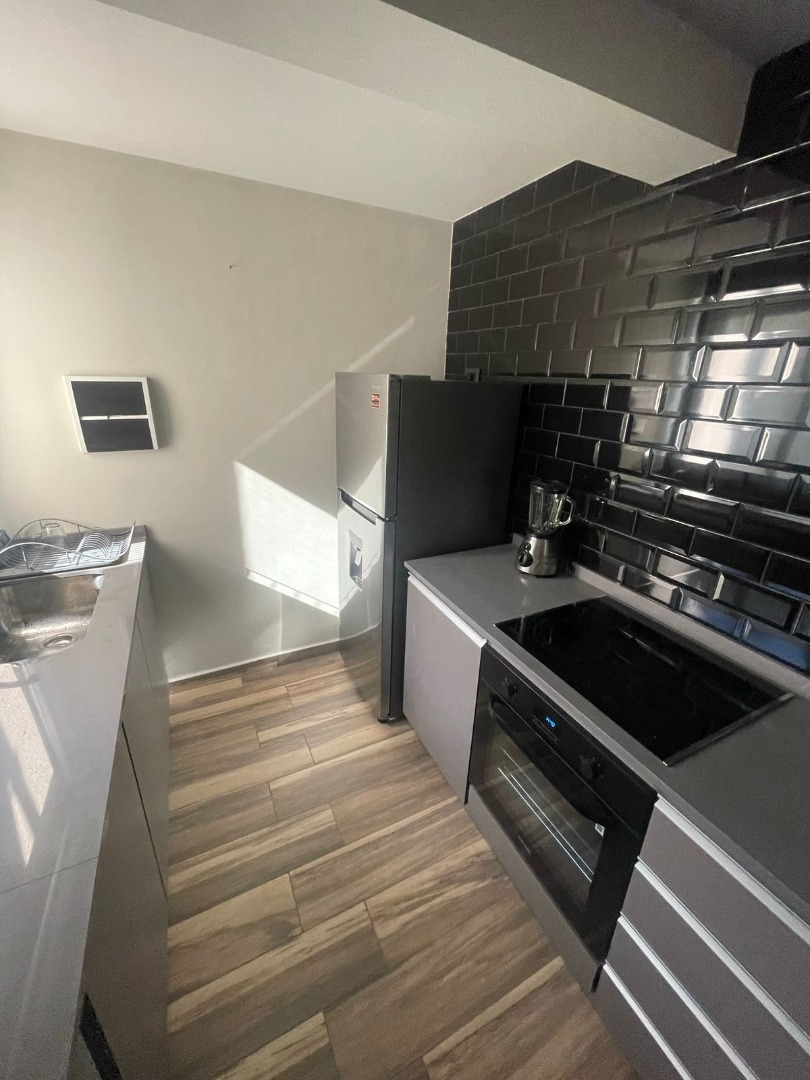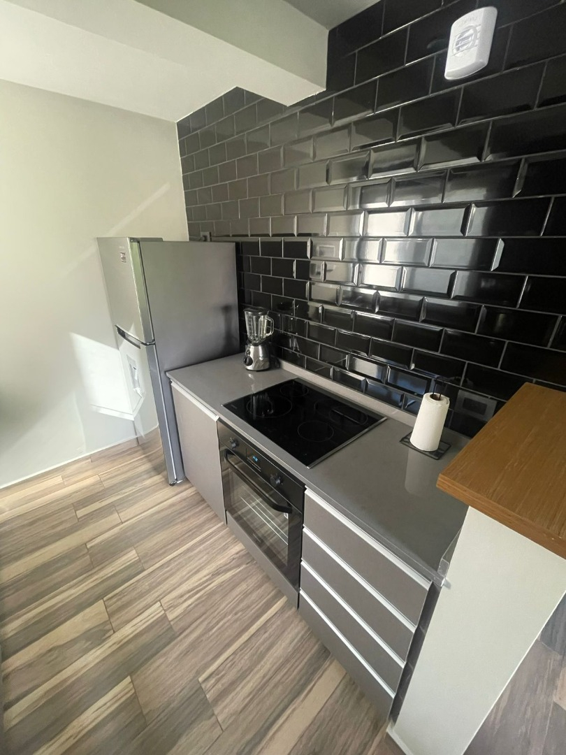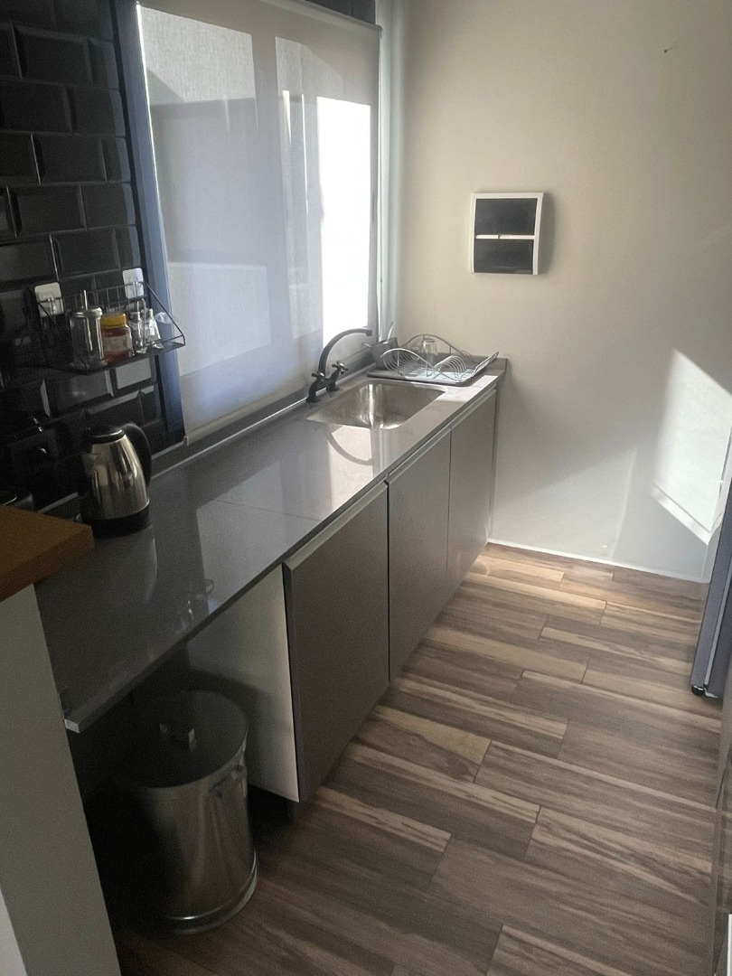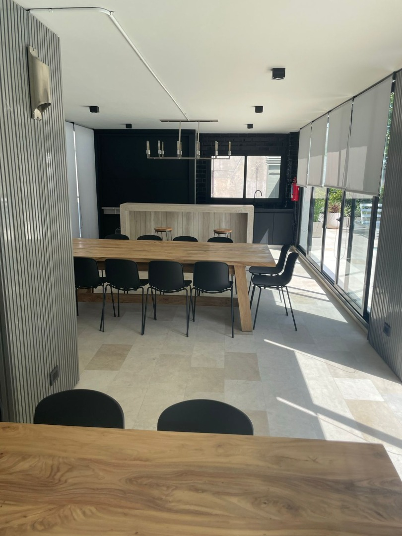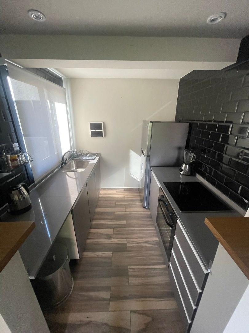 La cocina está integrada al ambiente, posee excelente ventilación y luz natural y esta equipada con horno, heladera con freezer, pequeños electrodomésticos y vajilla.