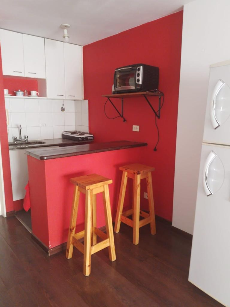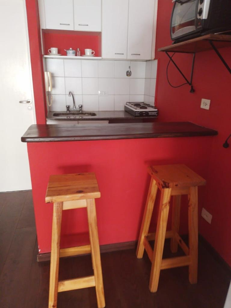 La cocina es integrada con moblaje y espacio para guardar los utensillos de cocina y alimentos.Dispone de vajilla,pava eléctrica, microondas, anafe, heladera con freezer, y está bien iluminada.