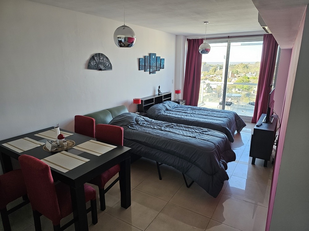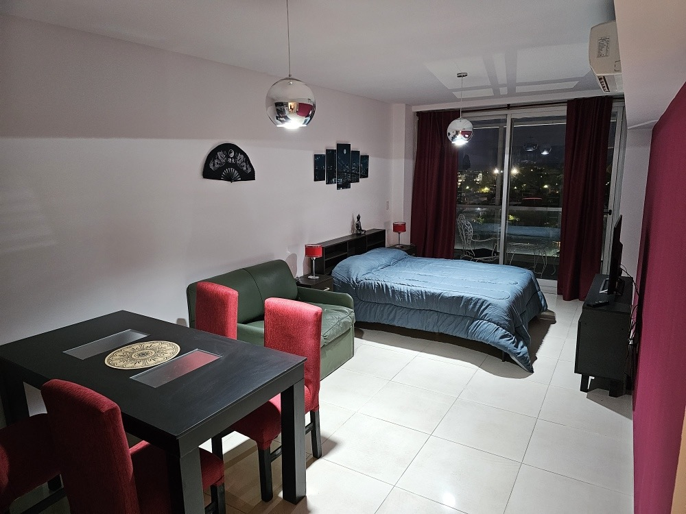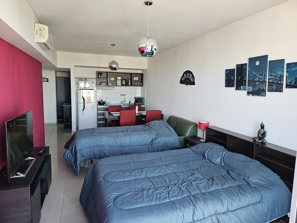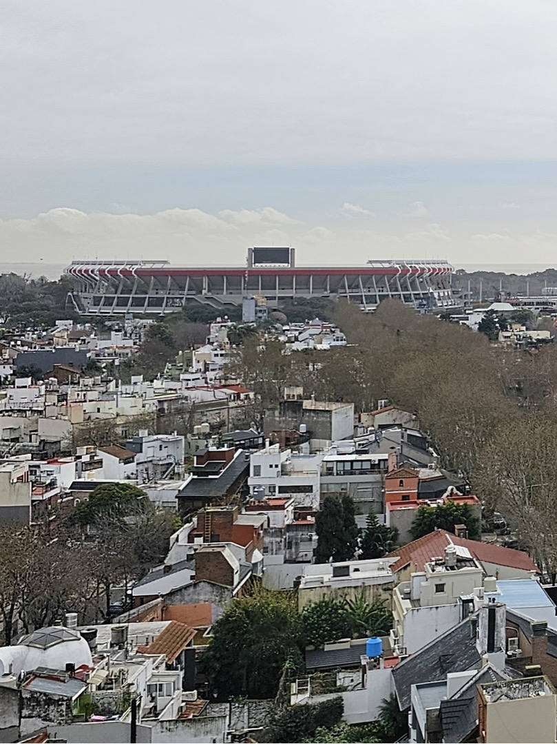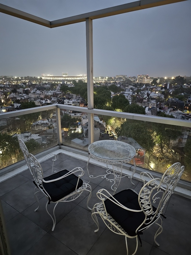 El departamento cuenta con balcon con vista a la cancha de River, con mesa y dos sillas, cuenta con aire acondicionado, dos camas de una plaza, mesa con silla, television. Cocina con heladera con frezzer, anafe eléctrica, utensilios de cocina, pava, cafetera.