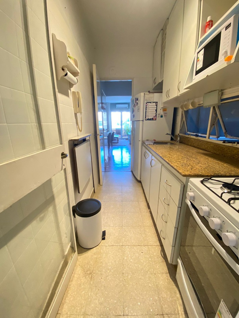 Se distribuye en Living comedor con balcón, aire acondicionado, TV. Cocina independiente equipada con horno a gas, heladera con freezer, microondas.