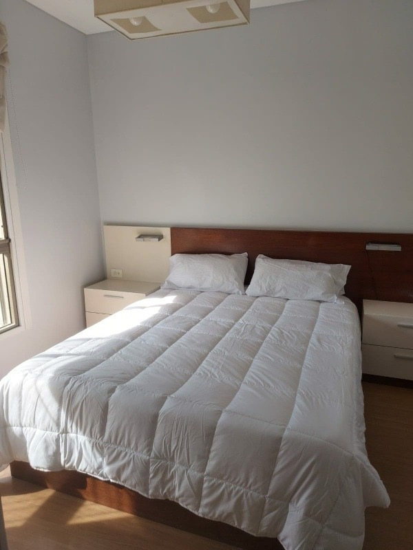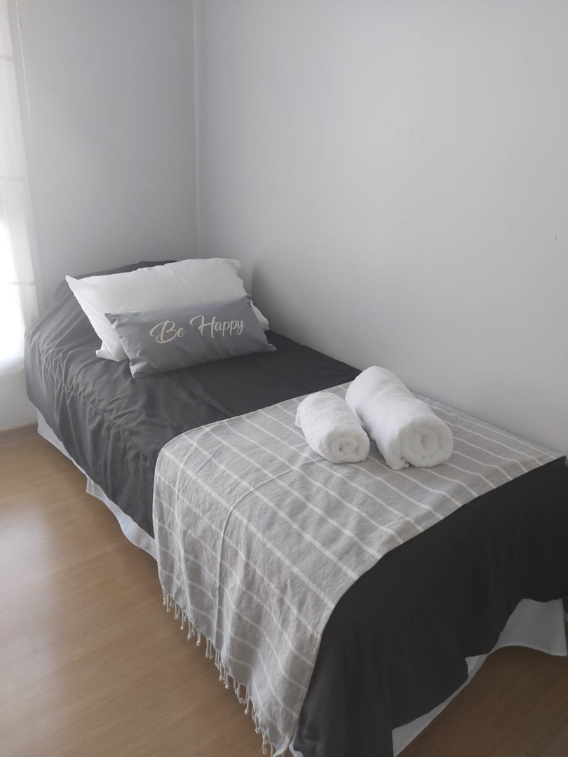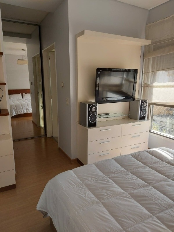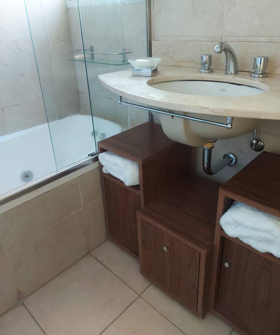 Cocina alacena y mesada, cocina con hornallas, horno, vajilla, heladera, microondas. Habitación principal con cama matrimonial con sabanas, acolchado blanco, almohadas, mesa de tv, con cajonera, TV, mesa de luz, aire acondicionado, placard, con vestidor. Toilette, con lava manos, espejo, bidet, inodoro.