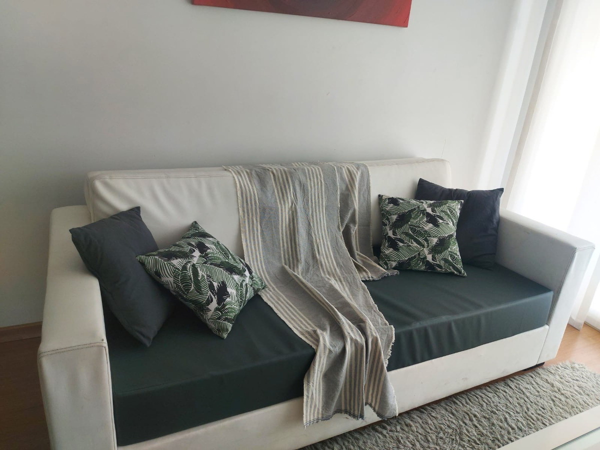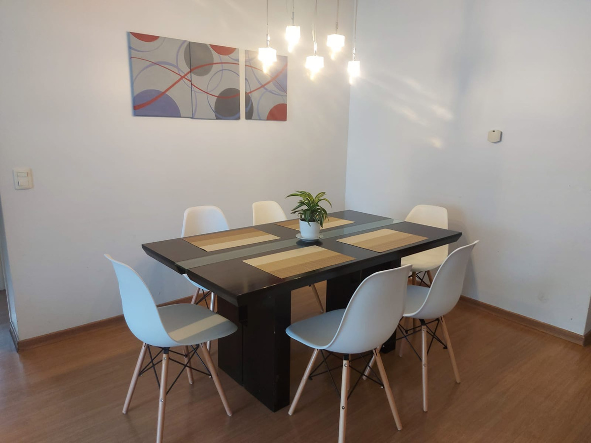 El departamento cuenta con living, con mesa y sillas de estilo nórdico, decoración de cuadros, lamparas, mesa de tv, con Tv, sillón, con mesa ratona, alfombra blanca, pisos de parque, gran ventanal, con cortina, con salida directa al balcón.