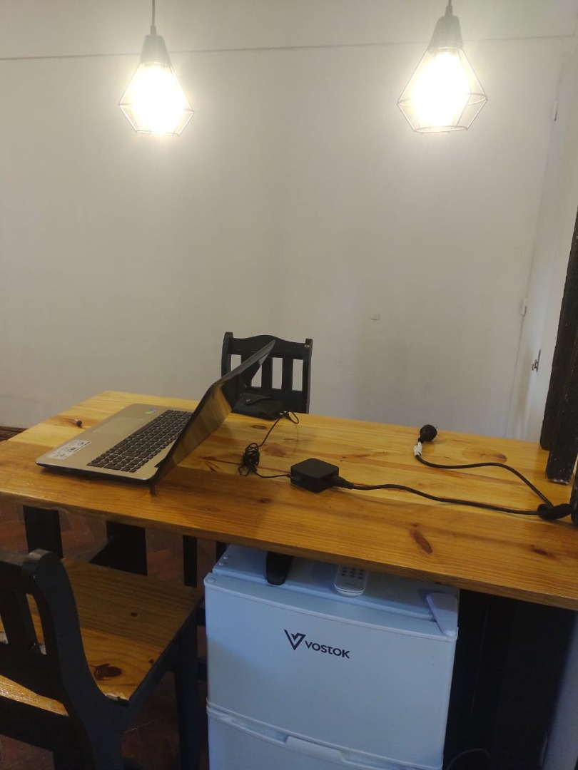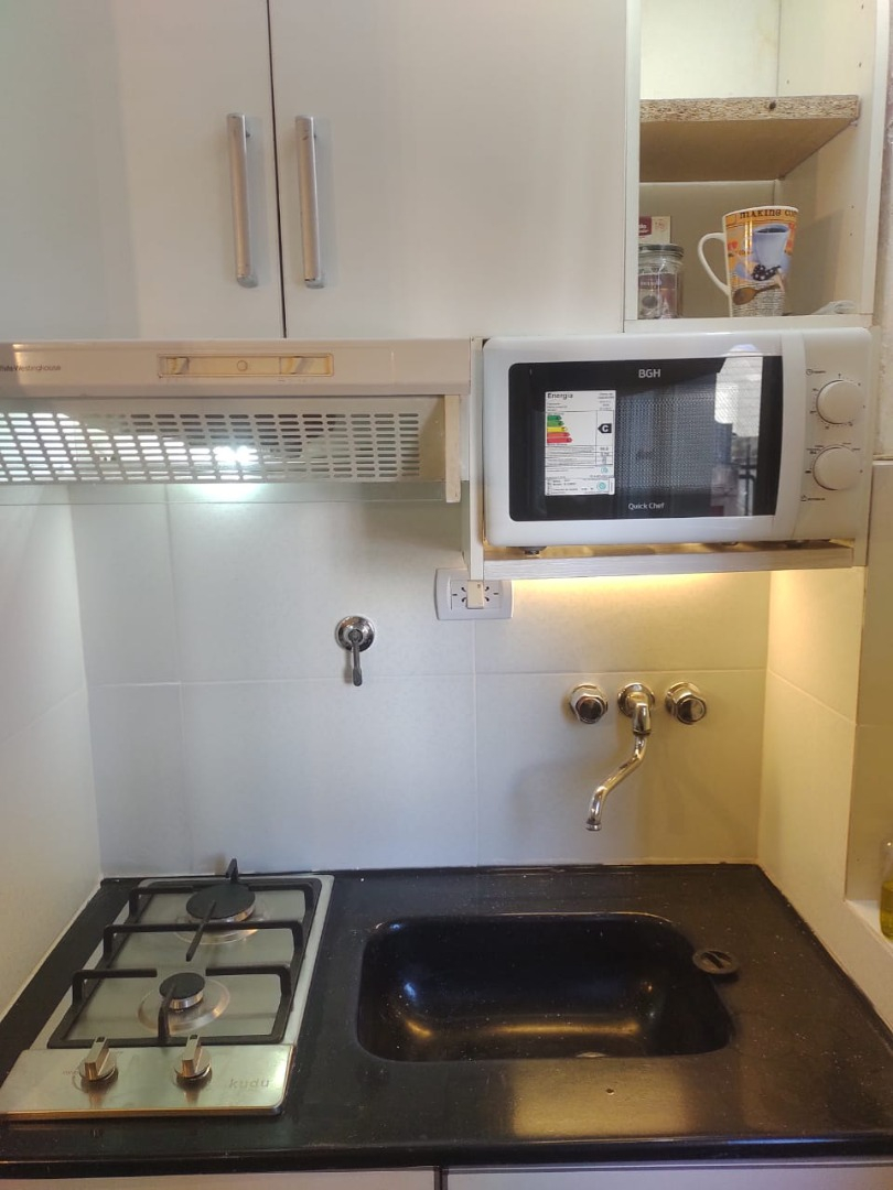 El departamento está completamente amoblado y equipado. Es silencioso y con buena iluminación gracias a amplias ventanas en piso medio. Cuenta con cama matrimonial con mesita de luz y lámpara. La cocina está amoblada con alacena, bajo mesada y mesa con taburetes, y completamente equipada con anafe a gas de dos hornallas, heladera pequeña y vajilla. El baño es completo con bañera y tiene ventilación natural. Tiene también un amplio placard doble empotrado con mucho espacio de guardado. Cuenta con aire acondicionado frío/calor y TV con Chromescast. .