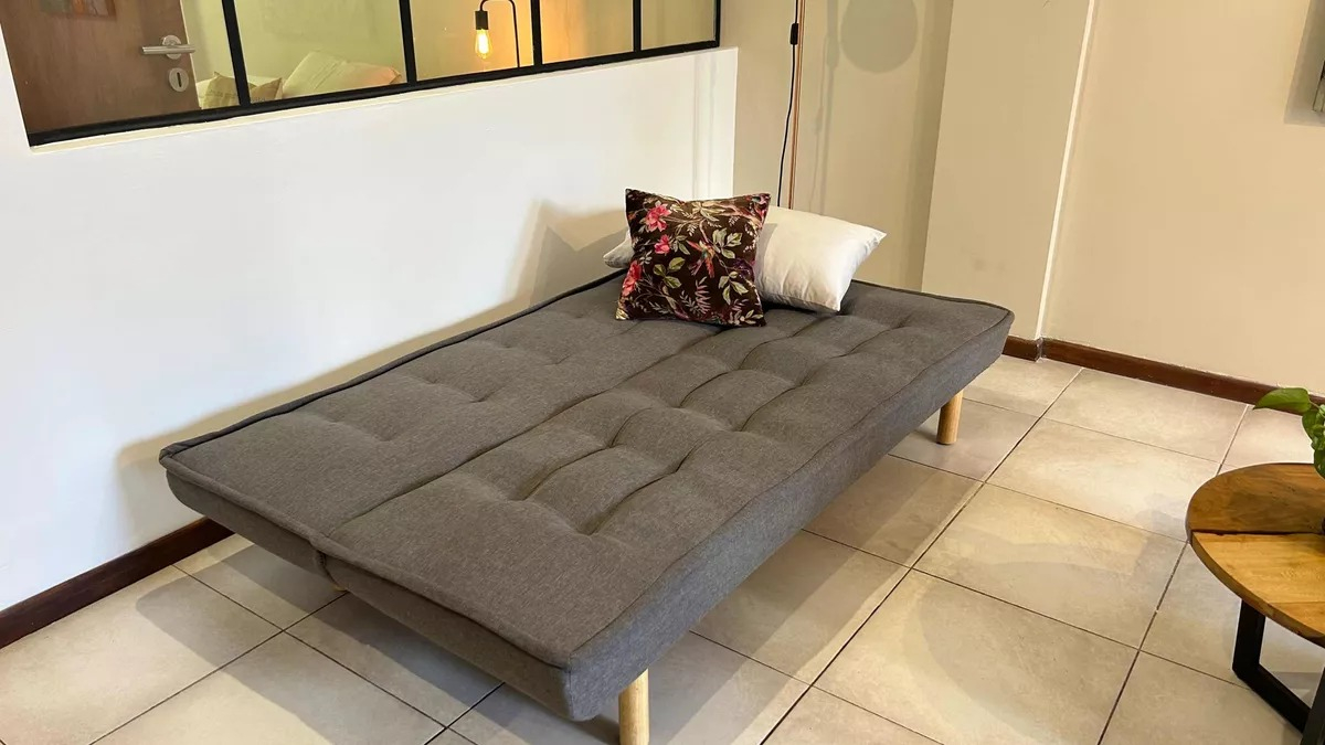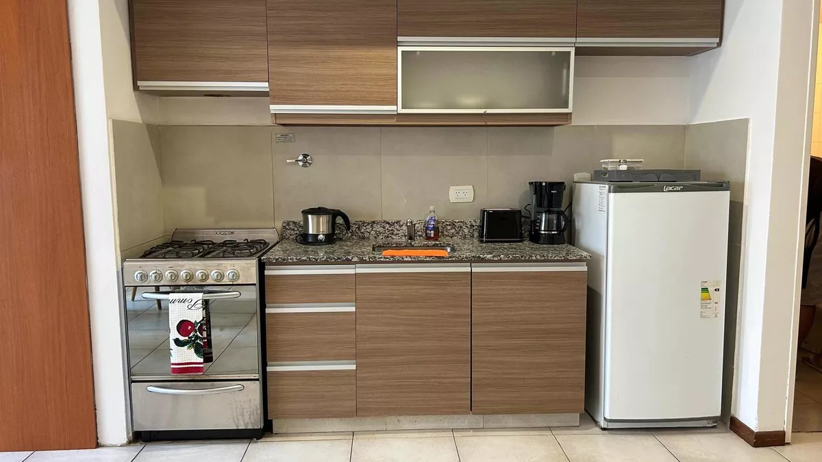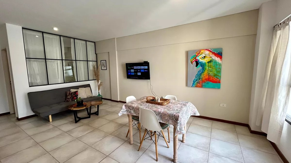 El departamento está ubicado en piso bajo, es amplio y luminoso. La cocina está completamente equipada con heladera, cocina a gas, electrodomésticos, utensilios de cocina y vajilla. El living comedor cuenta con mesa de comedor con sillas, sofá cama, Smart TV y ventana al contrafrente. El dormitorio cuenta con un ventanal con salida hacia un balcón al frente con sillas. Tiene también una ventana hacia el living con cortinas, cama tamaño matrimonial, mesas de luz, placard amplio y aire acondicionado split. El baño es completo con bañera. Incluye blanquería y tiene tender para colgar la ropa.