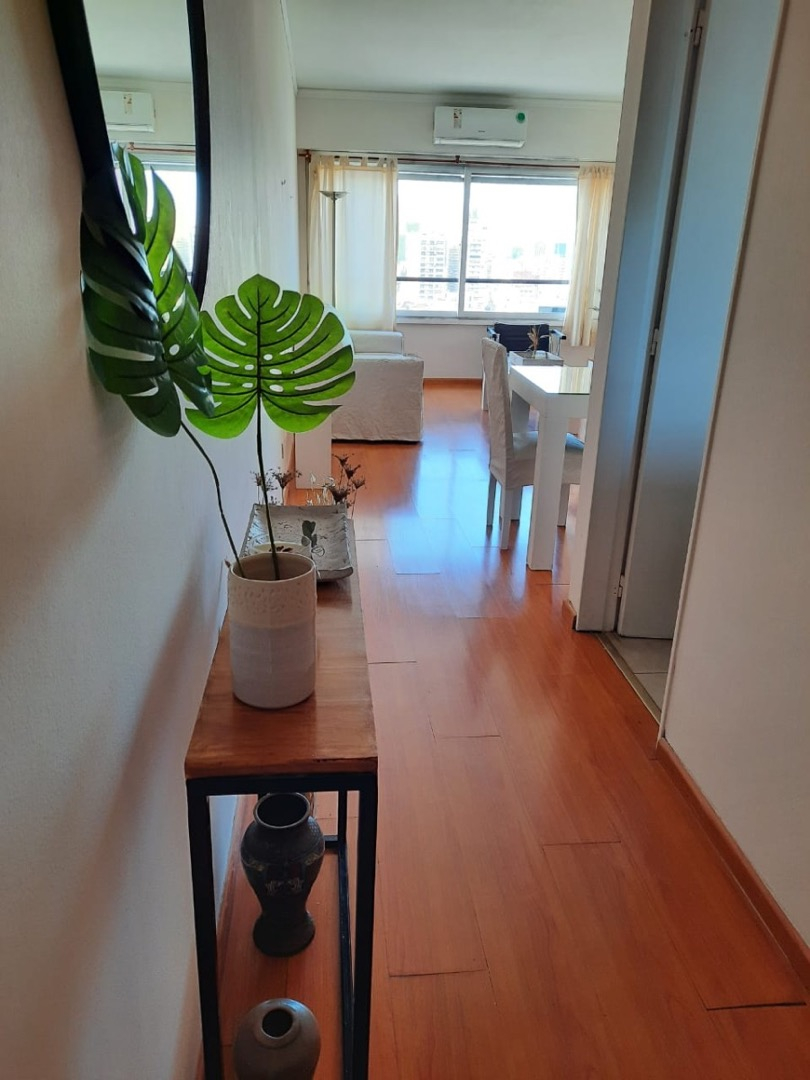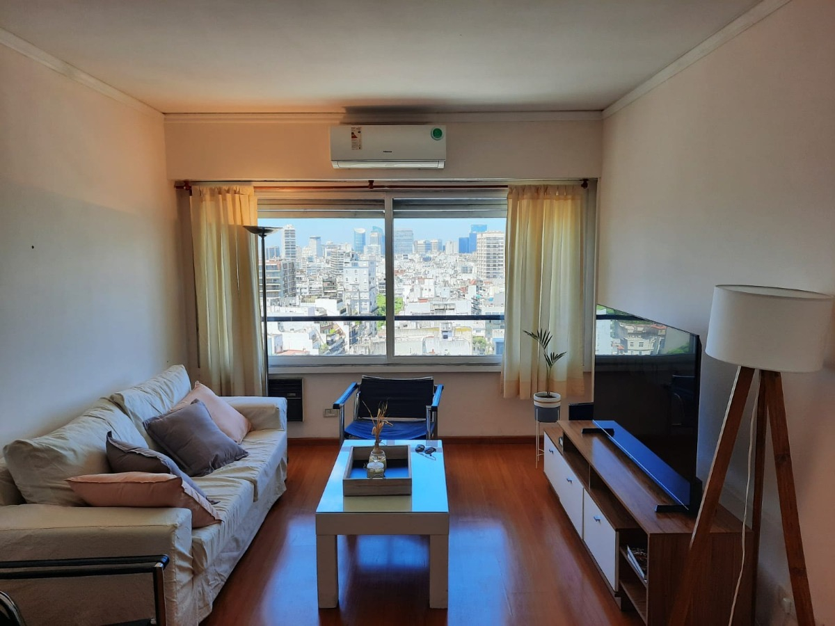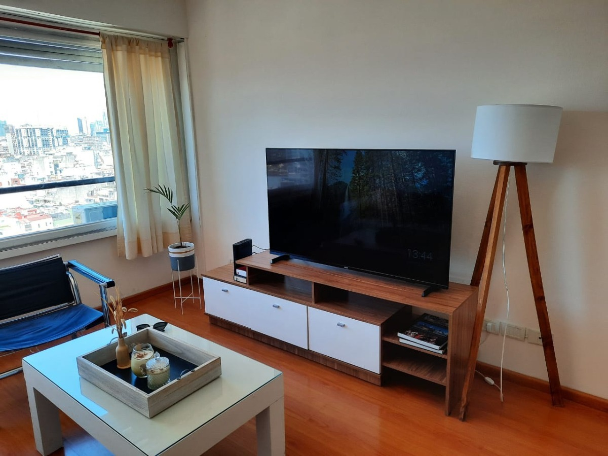 Living amplio con mesa y sillas, aire acondicionado, sillón, televisión. Se ubica en el piso 19.