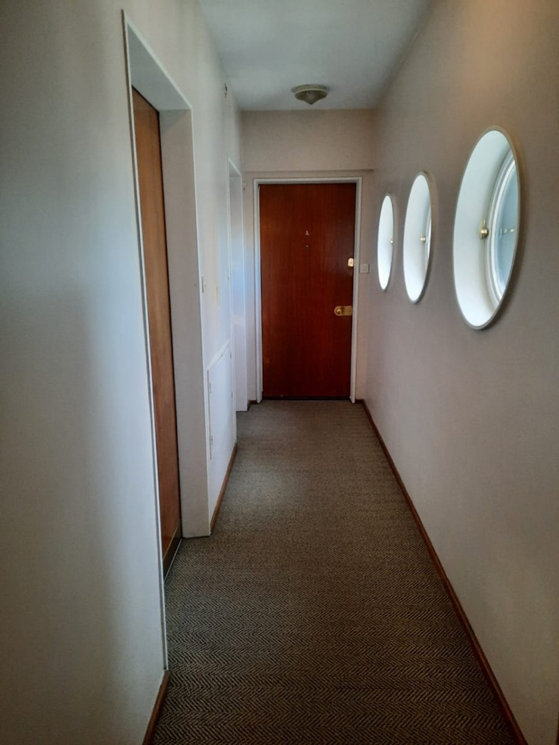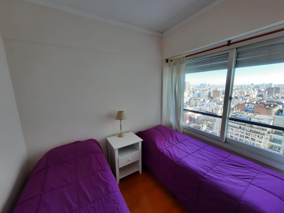 El departamento cuenta con: una habitación con cama matrimonial, mesas de luz, placard, segunda habitación con dos camas de una plaza con grandes ventanales.