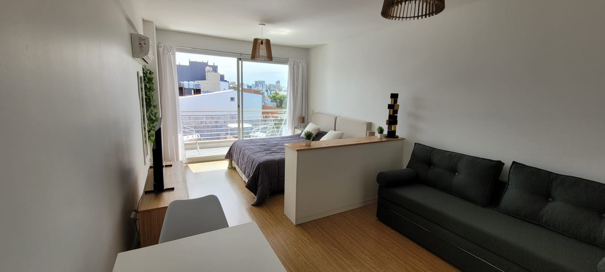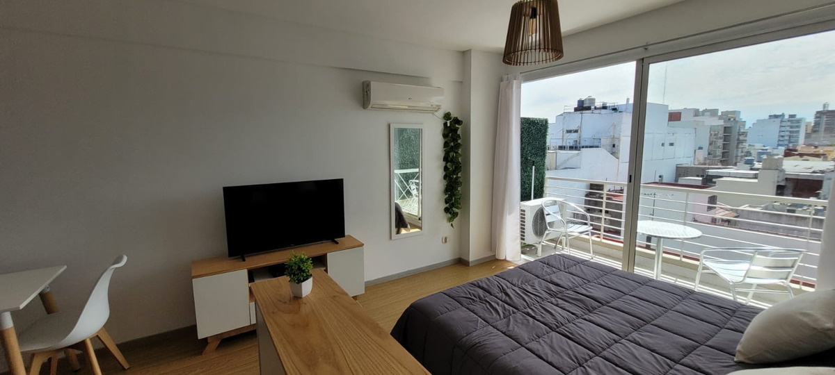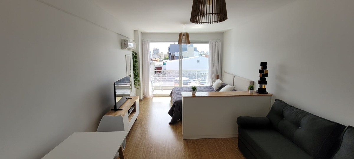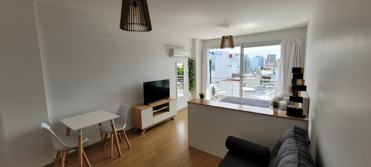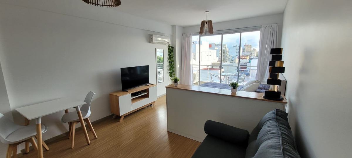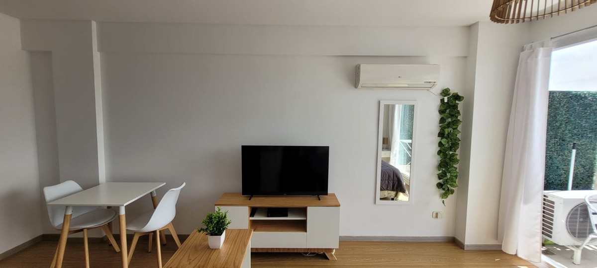 El departamento cuenta con sector de living con mesa con dos sillas, mueble de televisión, Aire acondicionado, sillón