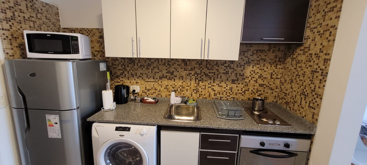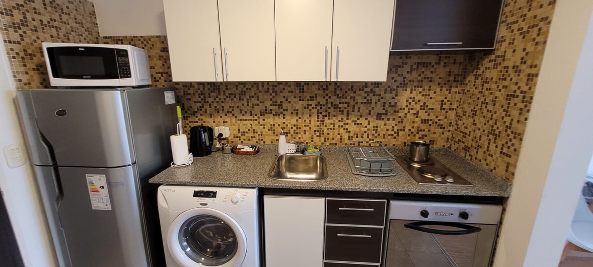 Cocina con alacena, bajo mesada, heladera con frezzer, microondas, anafe, lavarropas automático, utensilios de cocina pava eléctrica.