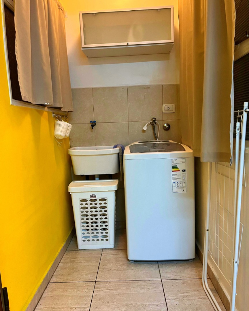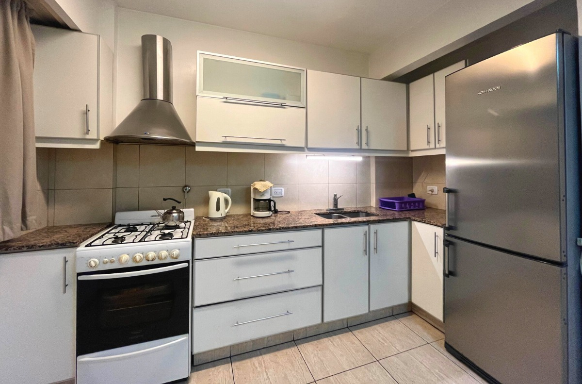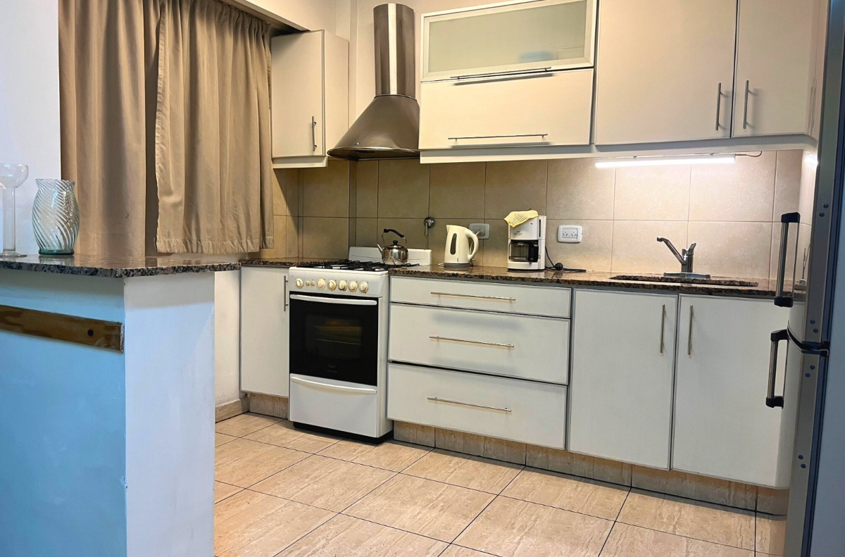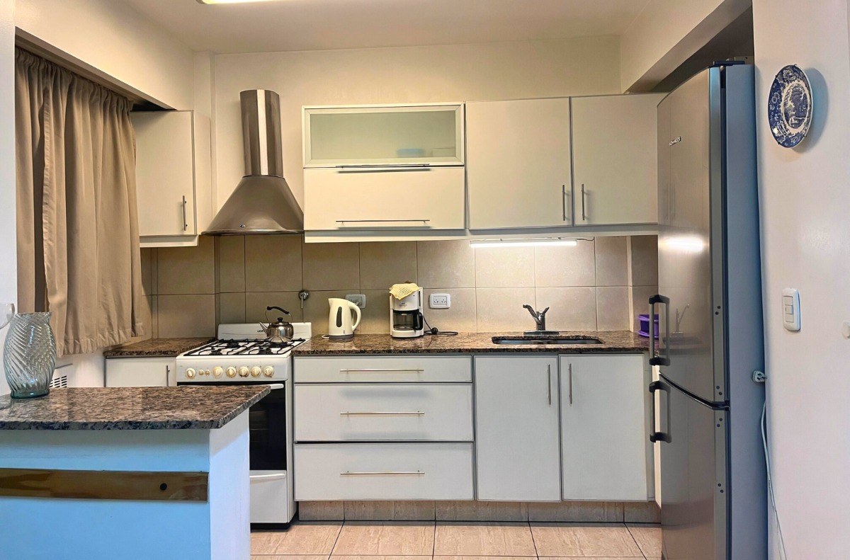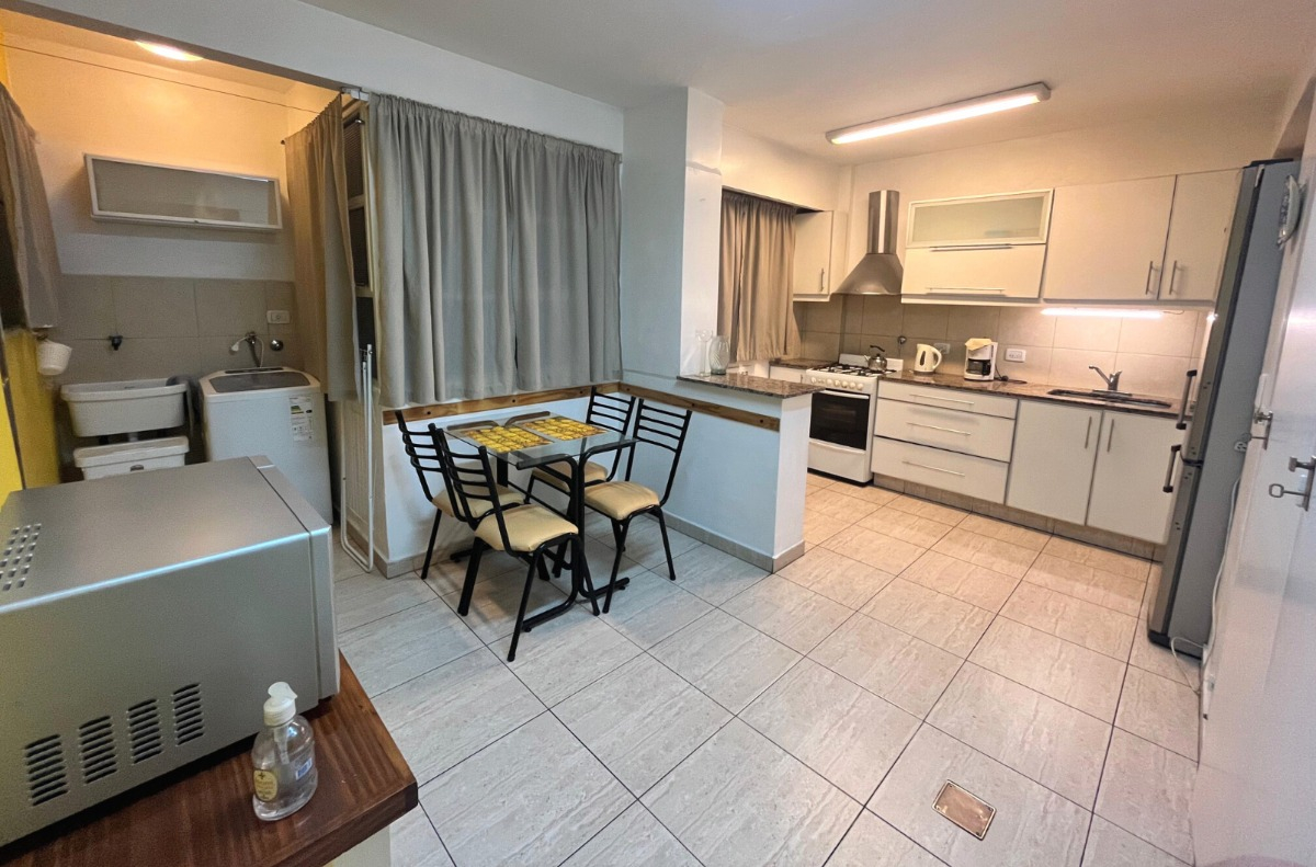 Cocina completa de generosas medidas con comedor diario, totalmente equipada con heladera con freezer, horno a gas, pequeños electrodomésticos, utensilios y vajilla.